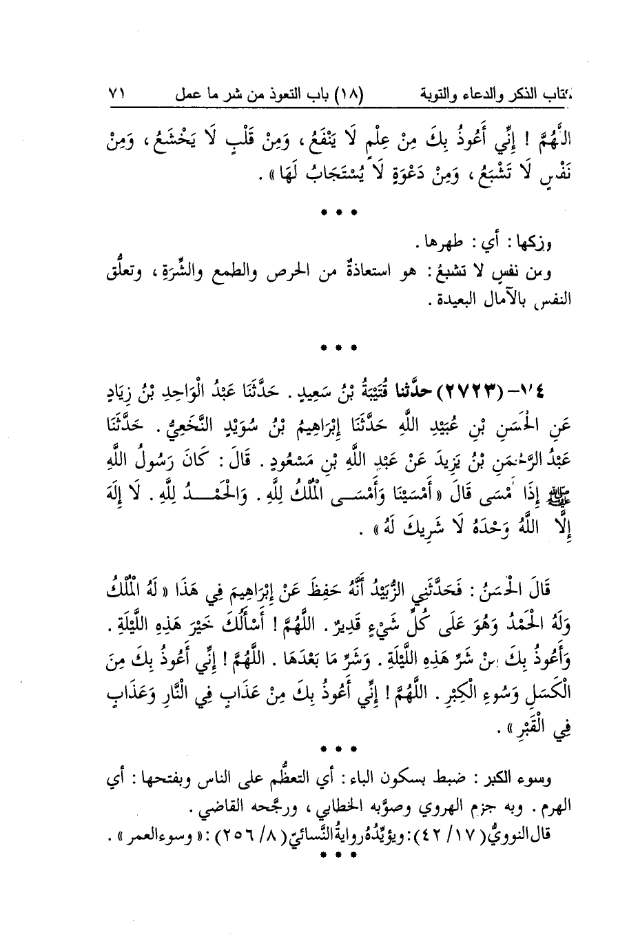 [2722] وزكها أَي طهرهَا وَمن نفس لَا تشبع هُوَ استعاذة من الْحِرْص والطمع والشره وَتعلق النَّفس بالآمال الْبَعِيدَة