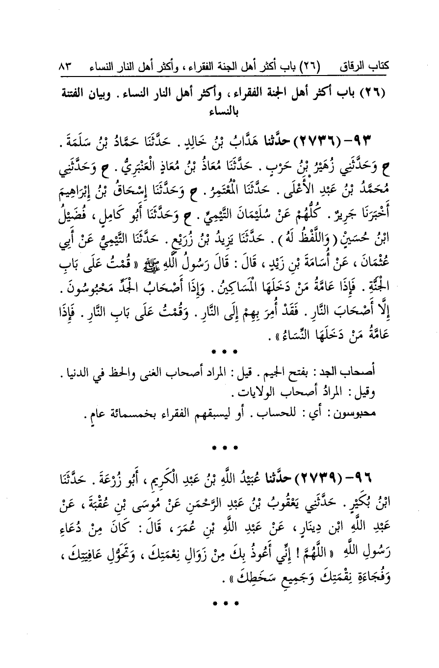 [2736] أَصْحَاب الْجد بِفَتْح الْجِيم قيل المُرَاد أَصْحَاب الْغنى والحظ فِي الدُّنْيَا وَقيل المُرَاد أَصْحَاب الولايات محبوسون أَي لِلْحسابِ أَو ليسبقهم الْفُقَرَاء بِخَمْسِمِائَة عَام