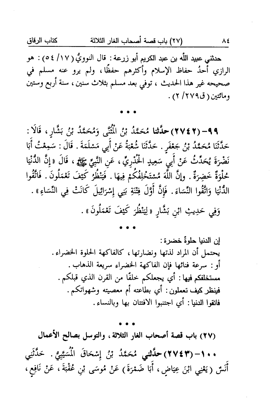 [2742] إِن الدُّنْيَا حلوة خضرَة يحْتَمل أَن المُرَاد لذتها ونضارتها كالفاكهة الحلوة الخضراء أَو سرعَة فنائها فَإِن الْفَاكِهَة الخضراء سريعة الذّهاب مستخلفكم فِيهَا أَي يجعلكم خلفا من الْقرن الَّذِي قبلكُمْ فَينْظر كَيفَ تَعْمَلُونَ أَي بِطَاعَتِهِ أم مَعْصِيَته وشهواتكم فَاتَّقُوا الدُّنْيَا أَي اجتنبوا الافتتان بهَا وبالنساء