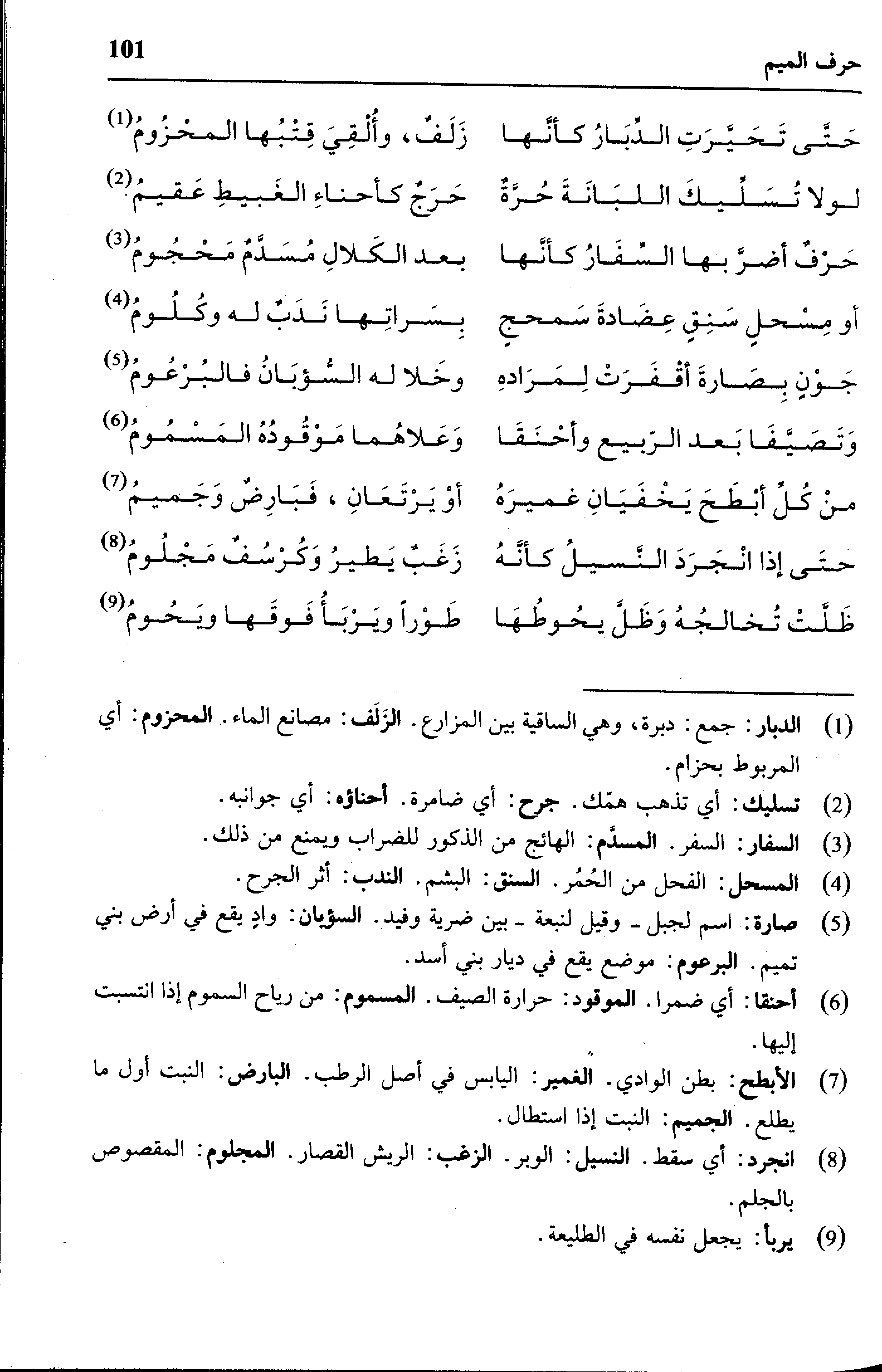 (¬1) الدبار: جمع: دبرة، وهي الساقية بين المزارع. الزَلَف: مصانع الماء. المحزوم: أي المربوط بحزام.
