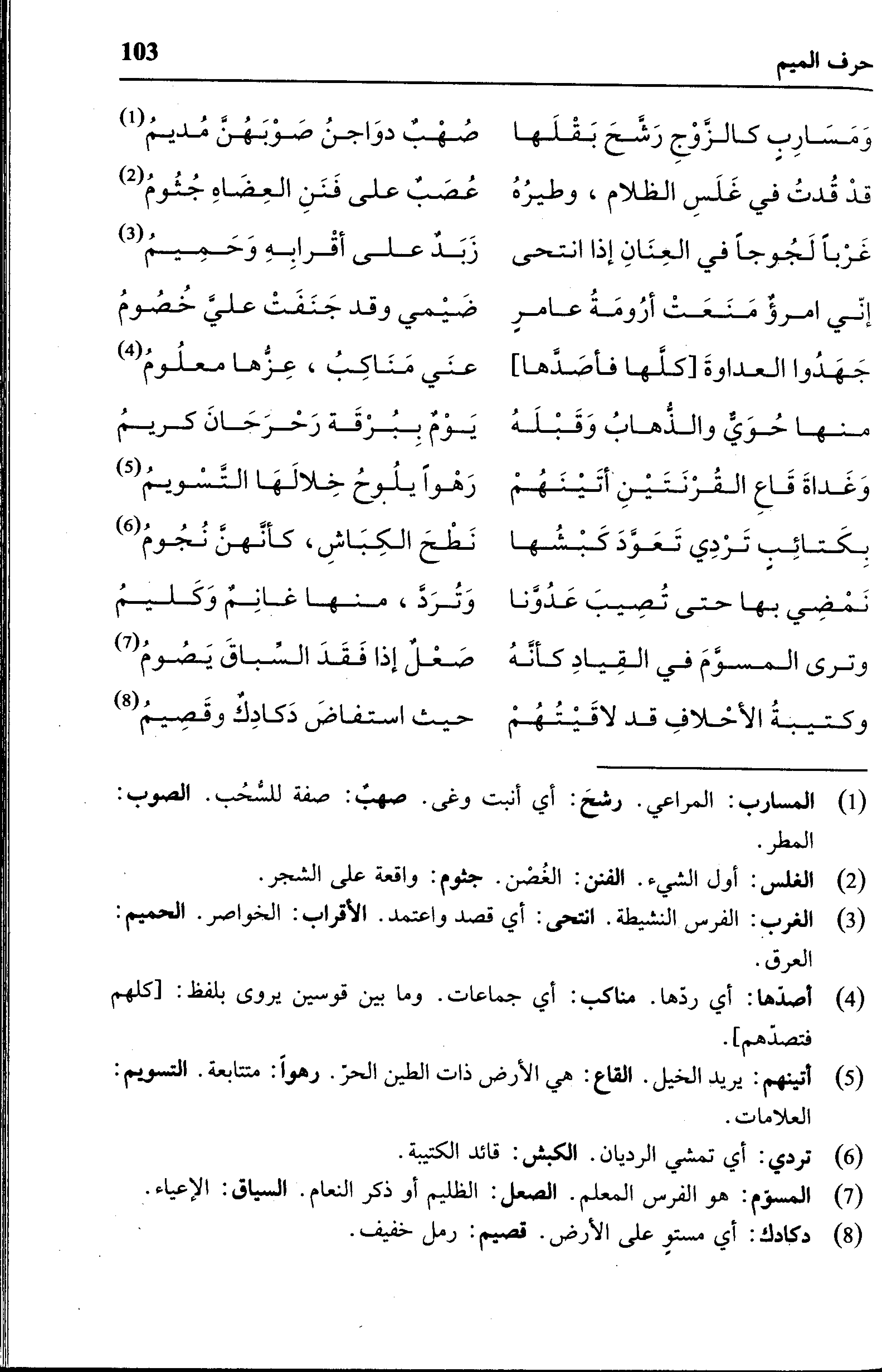 (¬7) المسوم: هو الفرس المعلم. الصعل: الظليم أو ذكر النعم. السياق: الإعياء.