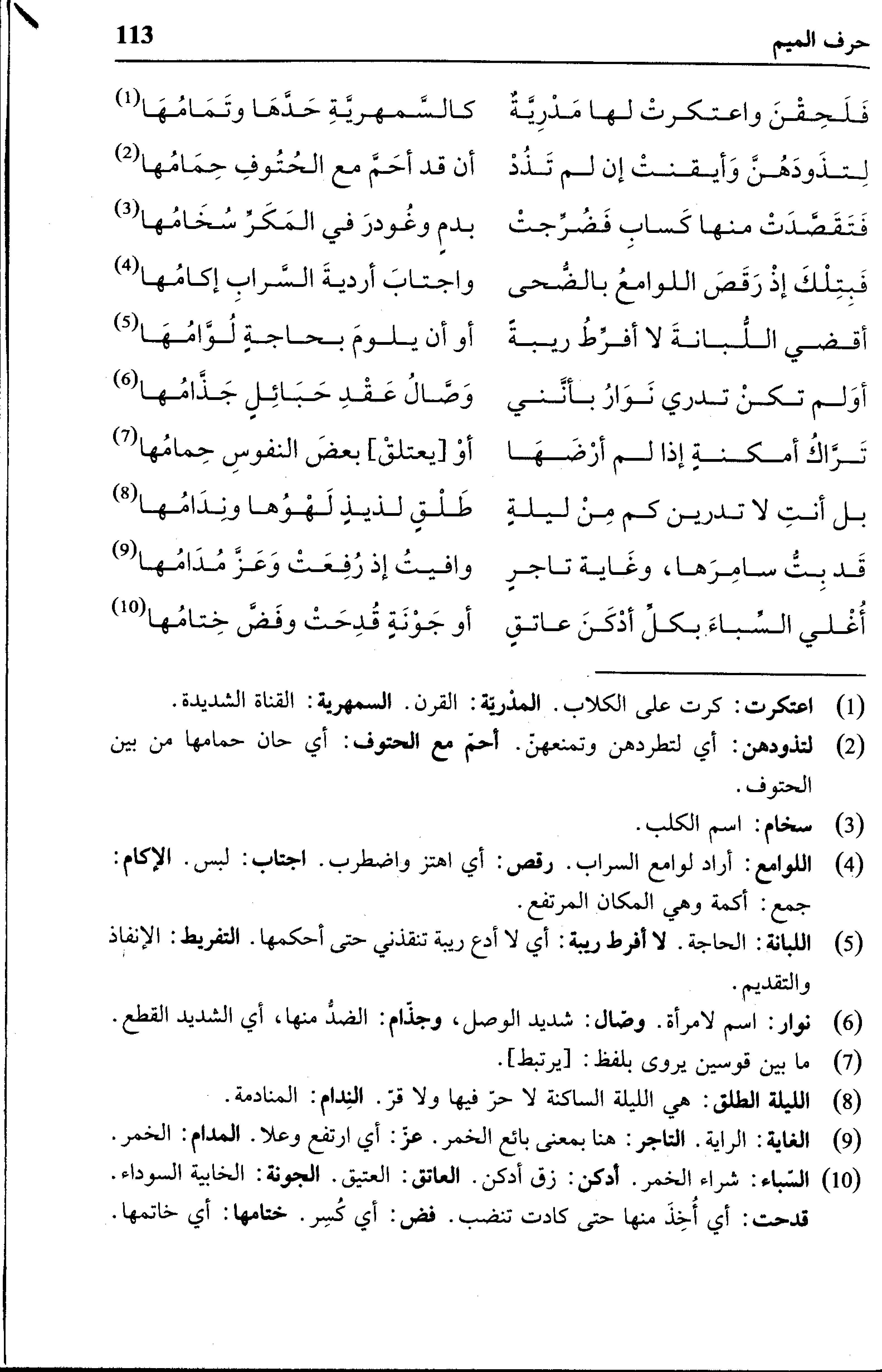 (¬10) السّباء: شراء الخمر. أدكن: زق أدكن. العاتق: العتيق. الجونة: الخابية السوداء. قدحت: أي أُخِذَ منها حتى كادت تنضب. فض: أي كُسِر. ختامها: أي خاتمها.