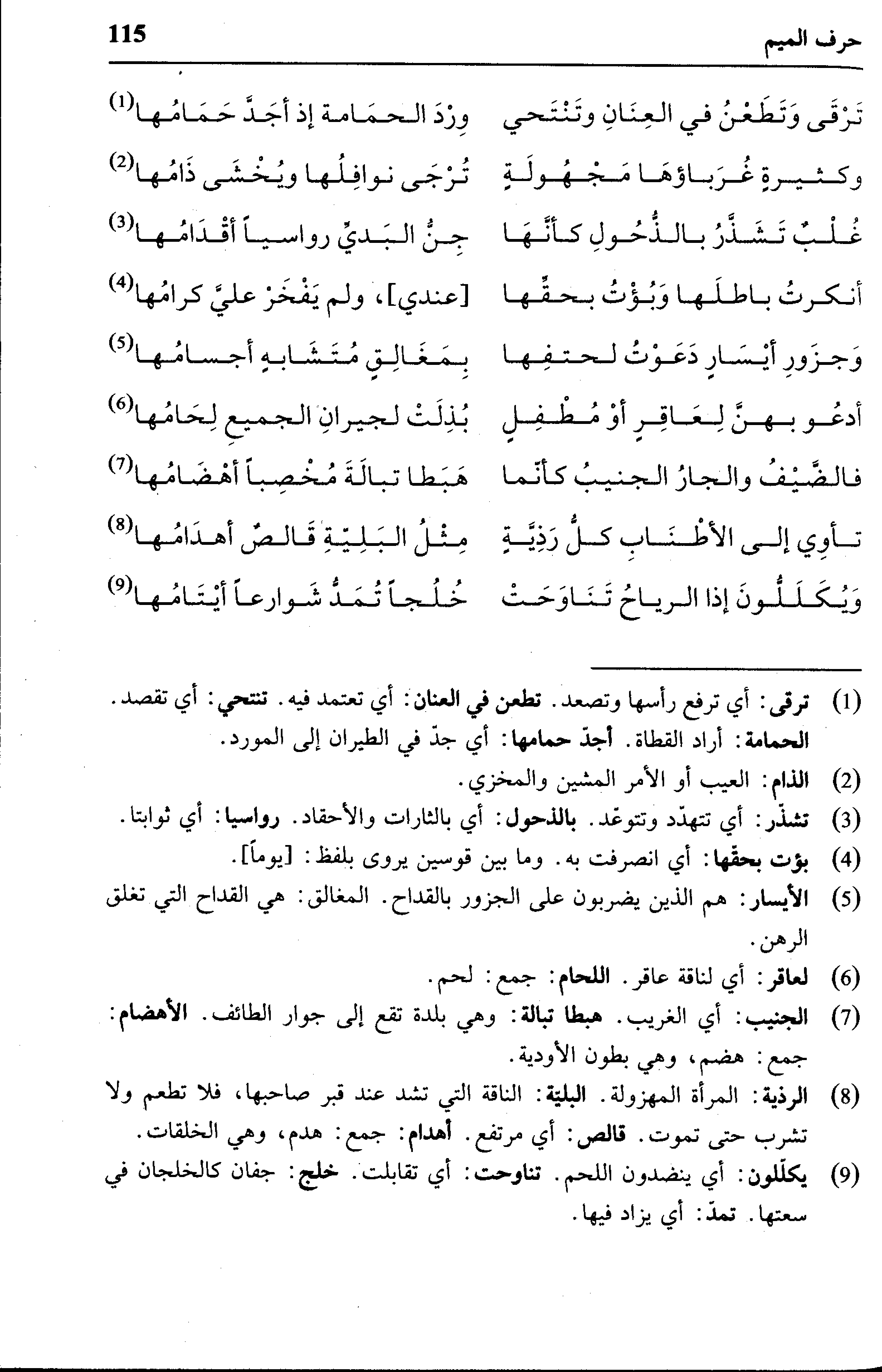 (¬1) ترقى: أي ترفع رأسها وتصعد. تطعن في العنان: أي تعتمد فيه. تنتحي: أي تقصد. الحمامة: أراد القطاة. أجدّ حمامها: أي جدّ في الطيران إلى المورود.