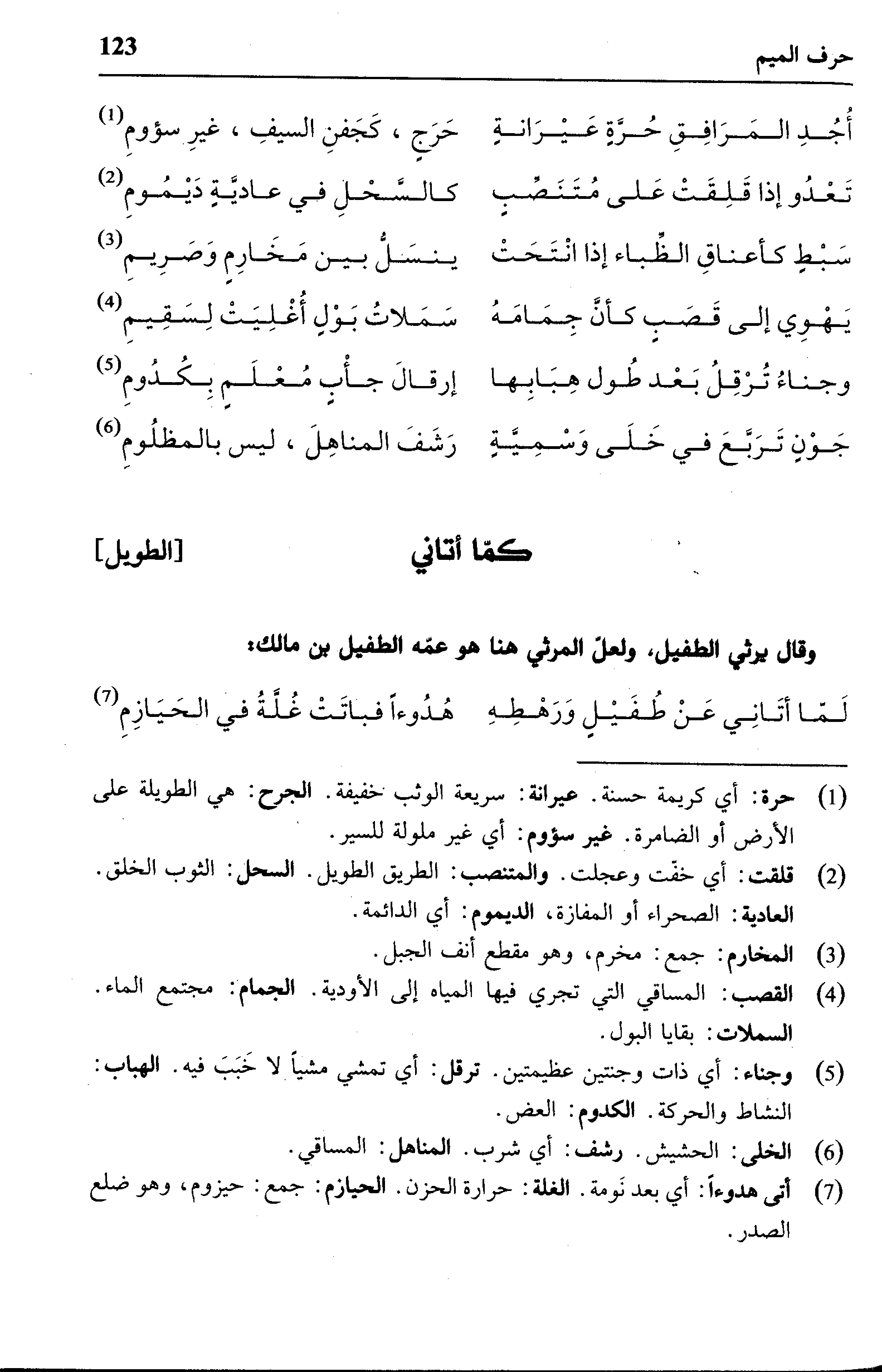 (¬4) القصب: المساقي التي تجري فيها المياه إلى الأودية. الجمام: مجتمع الماء. السملات: بقايا البول.
