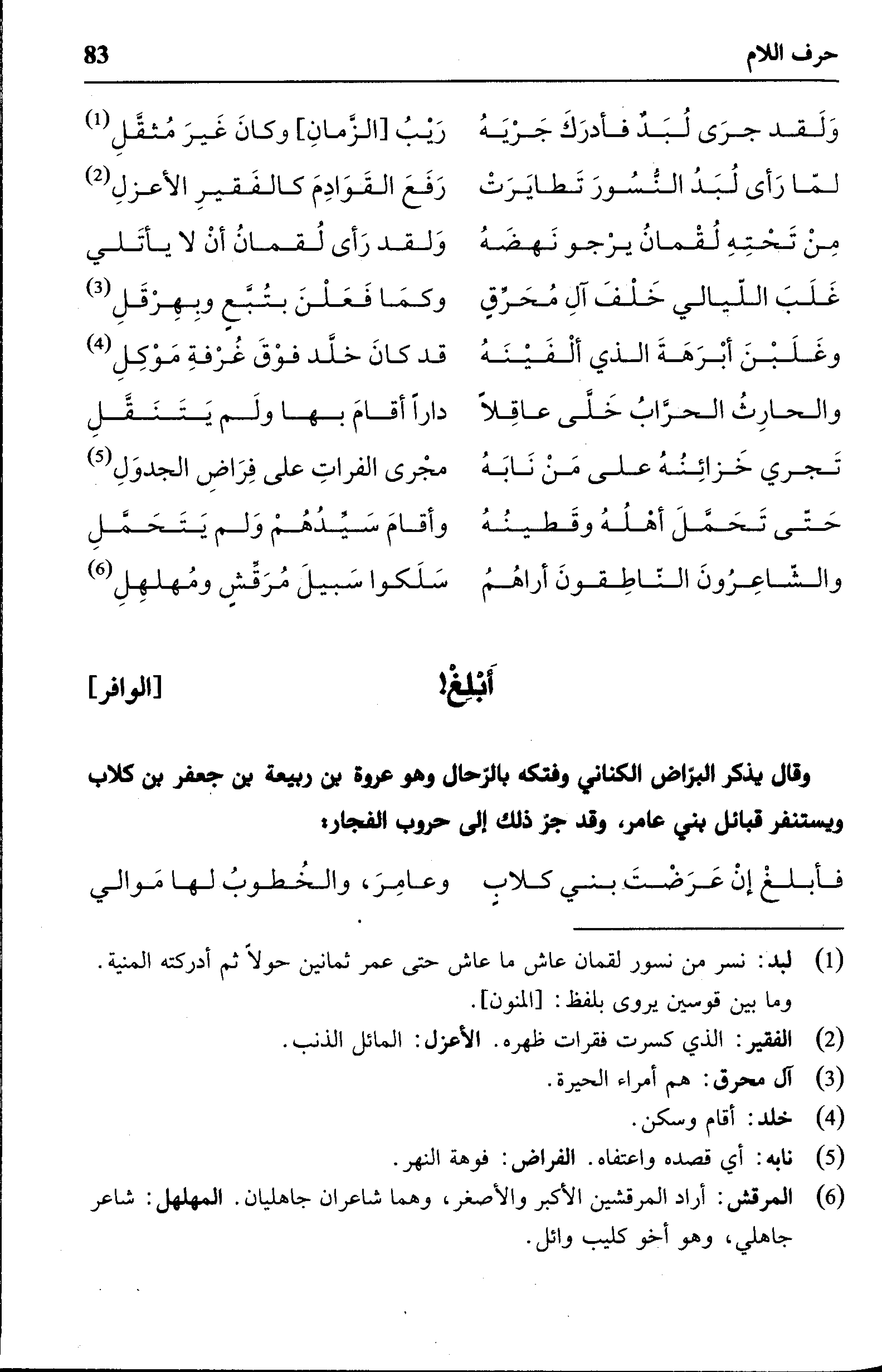 (¬6) المرقش: أراد المرقشين الأكبر والأصغر، وهما شاعران جاهليان. المهلهل: شاعر جاهلي، وهو أخو كليب وائل.