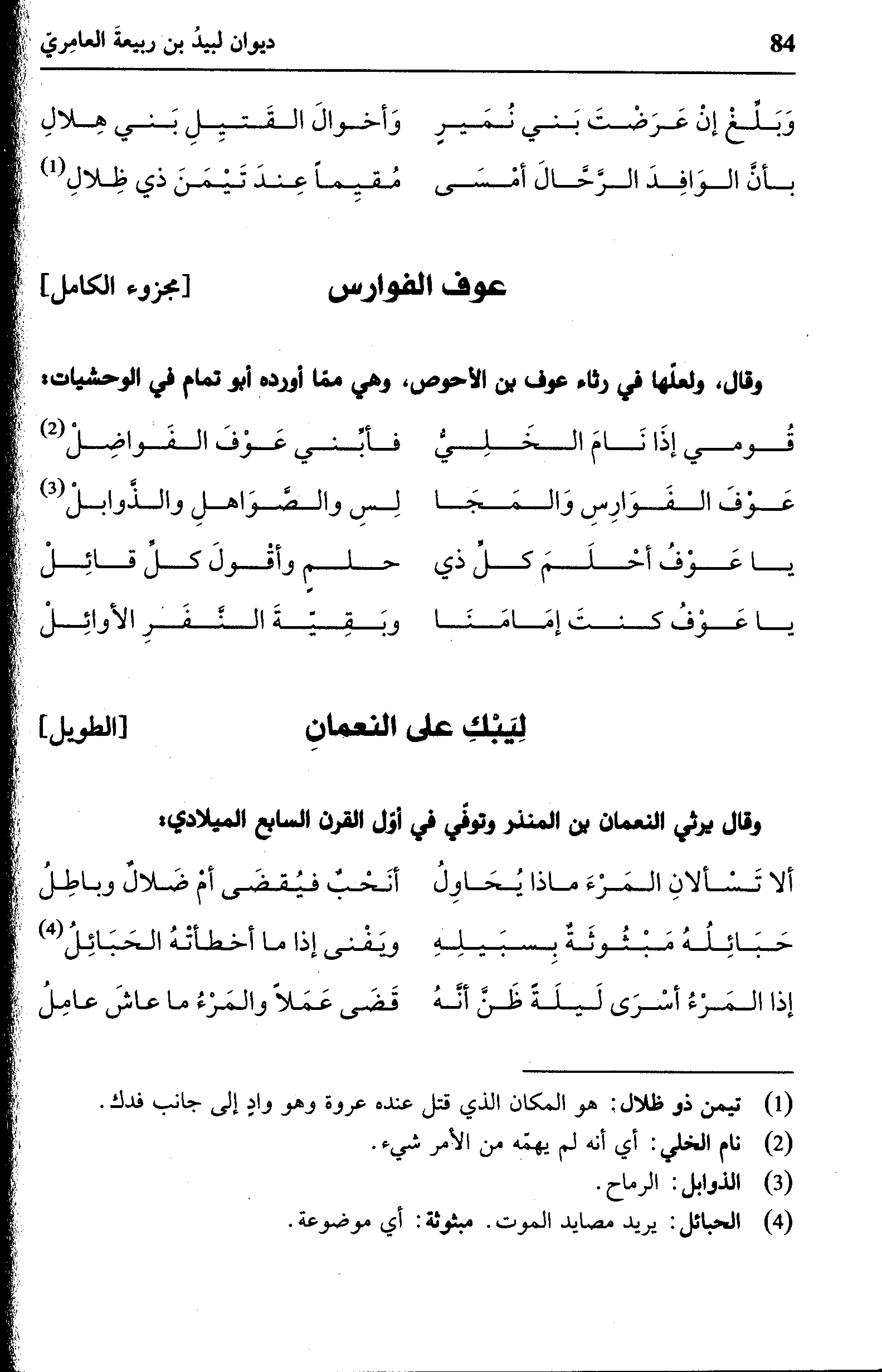 عَوْفَ الفَوَارِسِ وَالمَجَا ... لِسِ والصَّوَاهلِ والذَّوابلْ (¬3)