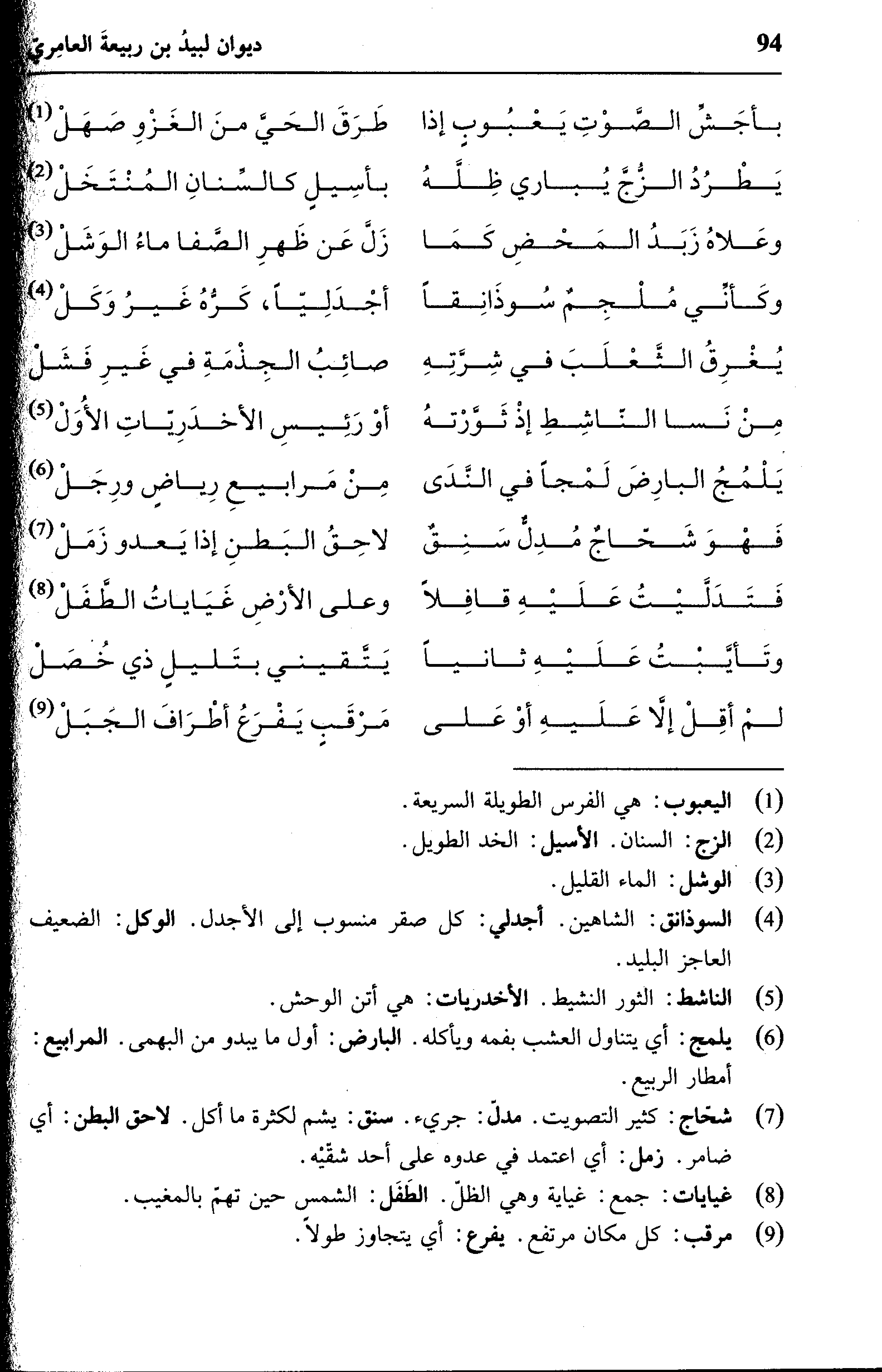(¬7) شحّاج: كثير التصويت. مدلّ: جريء. سنق: يشم لكثرة ما أكل. لاحق البطن: أي ضامر. زمل: أي اعتمد في عدوه على أحد شقّيْه.
