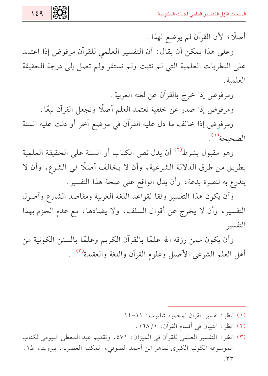 (¬٣) انظر: التفسير العلمي للقرآن في الميزان: ٤٧١، وتقديم عبد المعطي البيومي لكتاب الموسوعة الكونية الكبرى لماهر ابن أحمد الصوفي، المكتبة العصرية، بيروت، ط ١: ٣٣.