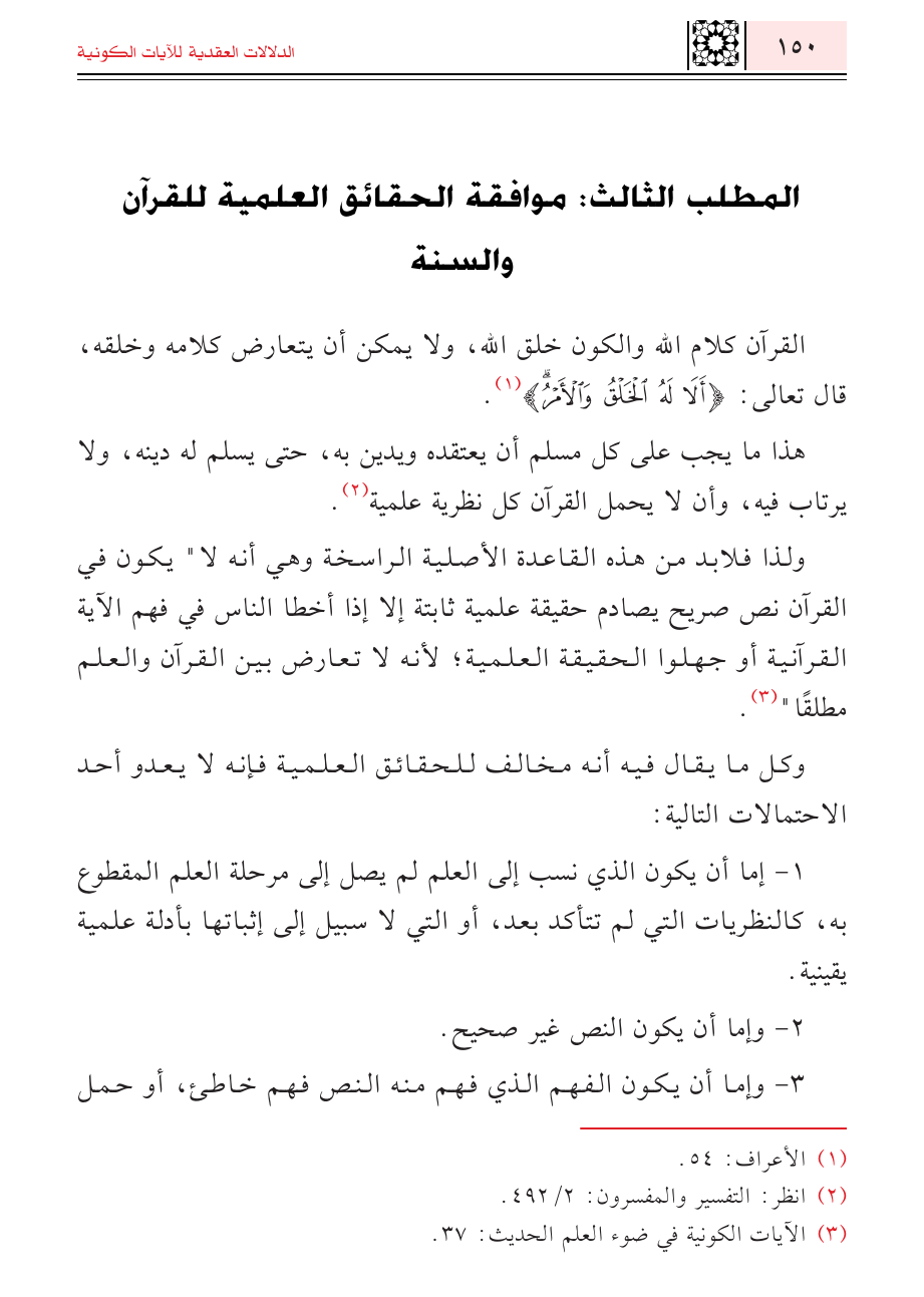 القرآن كلام الله والكون خلق الله، ولا يمكن أن يتعارض كلامه وخلقه، قال تعالى: {أَلَا لَهُ الْخَلْقُ وَالْأَمْرُ} (¬١).