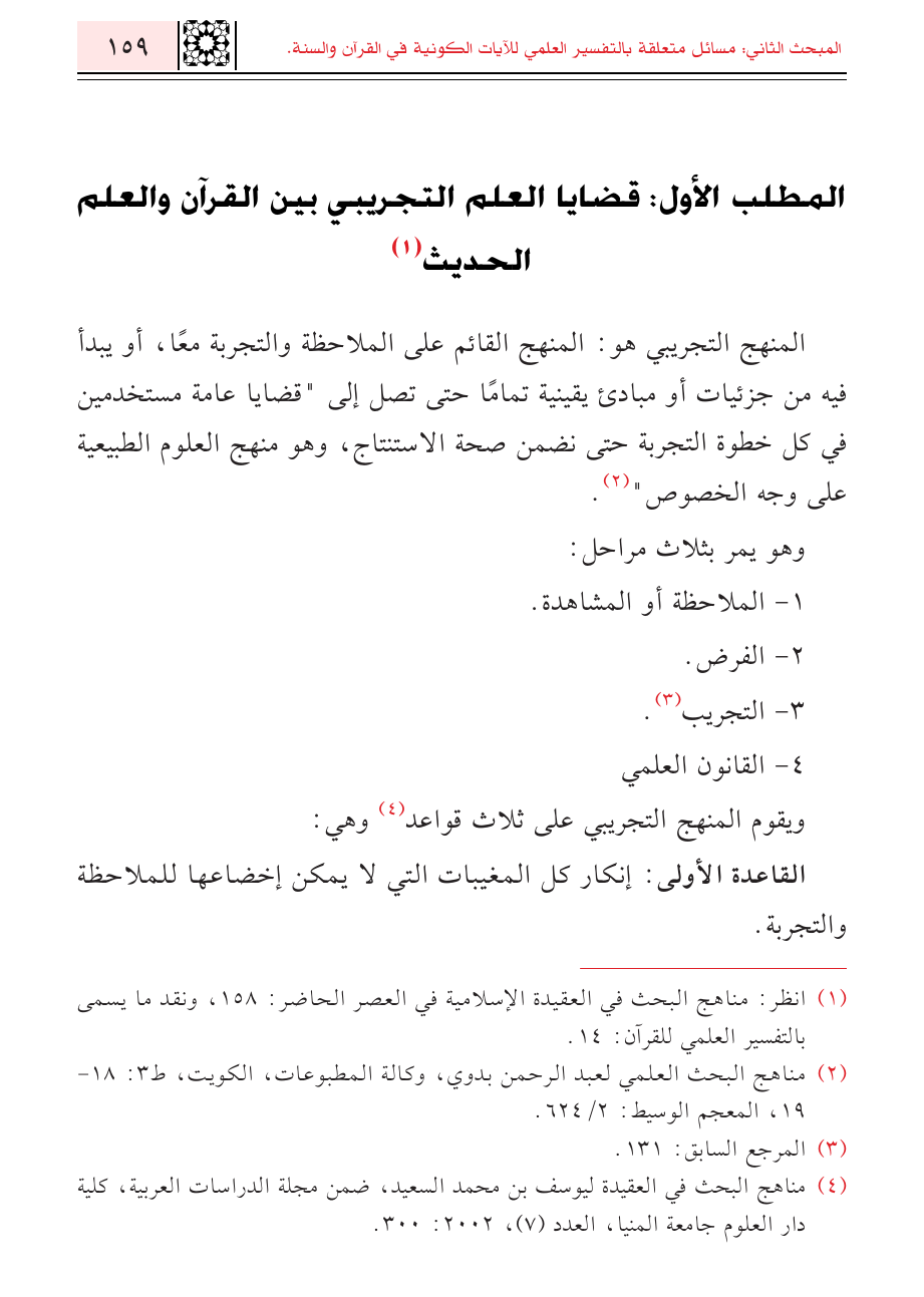 (¬١) انظر: مناهج البحث في العقيدة الإسلامية في العصر الحاضر: ١٥٨، ونقد ما يسمى بالتفسير العلمي للقرآن: ١٤.
