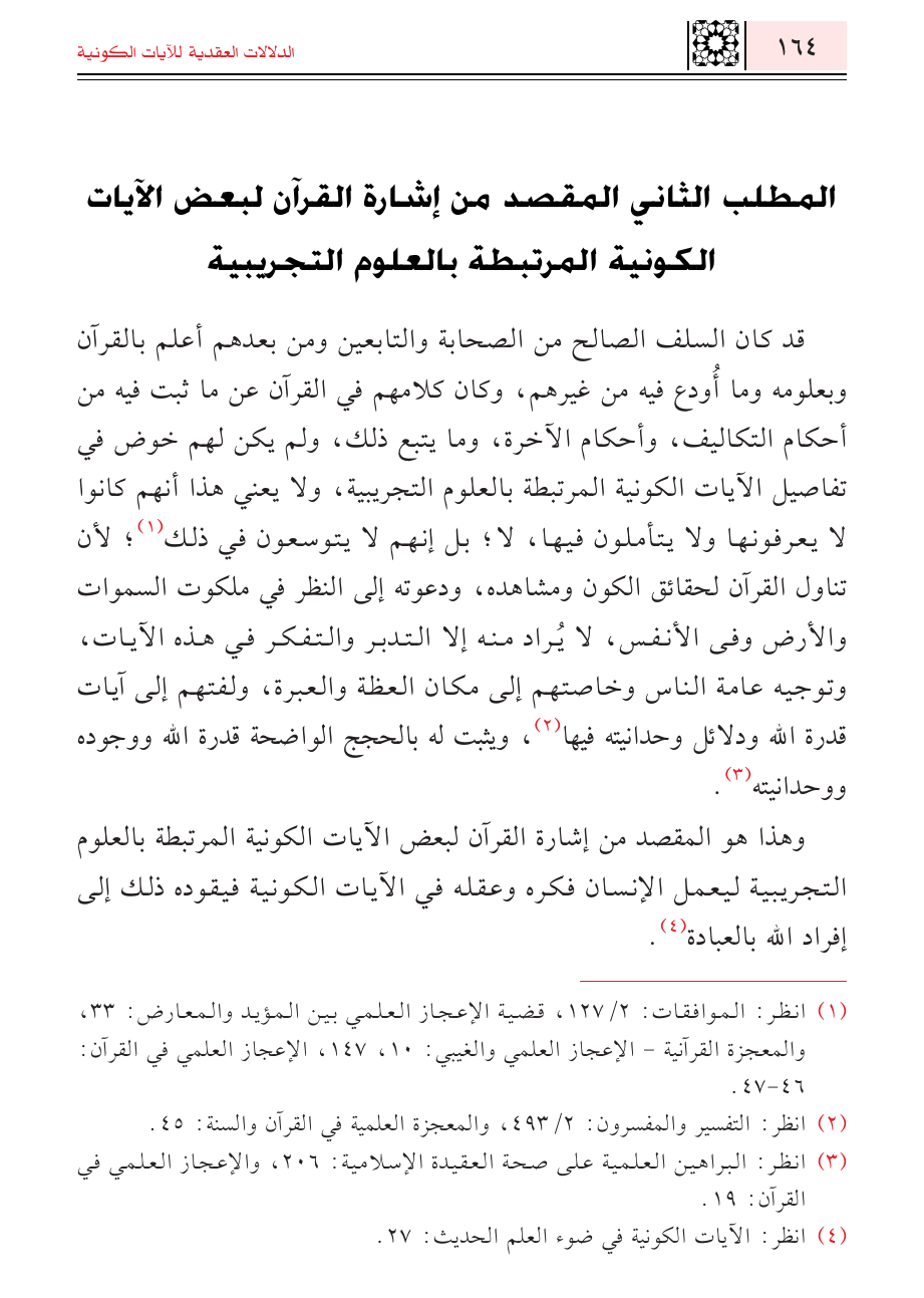 وهذا هو المقصد من إشارة القرآن لبعض الآيات الكونية المرتبطة بالعلوم التجريبية ليعمل الإنسان فكره وعقله في الآيات الكونية فيقوده ذلك إلى إفراد الله بالعبادة (¬٤).