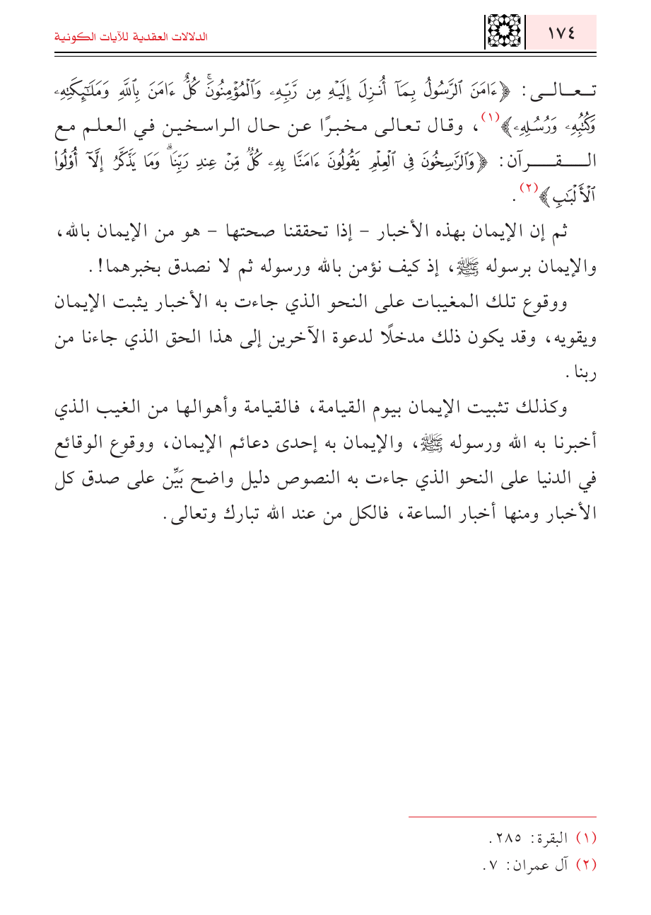 تعالى: {آمَنَ الرَّسُولُ بِمَا أُنْزِلَ إِلَيْهِ مِنْ رَبِّهِ وَالْمُؤْمِنُونَ كُلٌّ آمَنَ بِاللَّهِ وَمَلَائِكَتِهِ وَكُتُبِهِ وَرُسُلِهِ} (¬١)، وقال تعالى مخبراً عن حال الراسخين في العلم مع القرآن: {وَالرَّاسِخُونَ فِي الْعِلْمِ يَقُولُونَ آمَنَّا بِهِ كُلٌّ مِنْ عِنْدِ رَبِّنَا وَمَا يَذَّكَّرُ إِلَّا أُولُو الْأَلْبَابِ} (¬٢).
