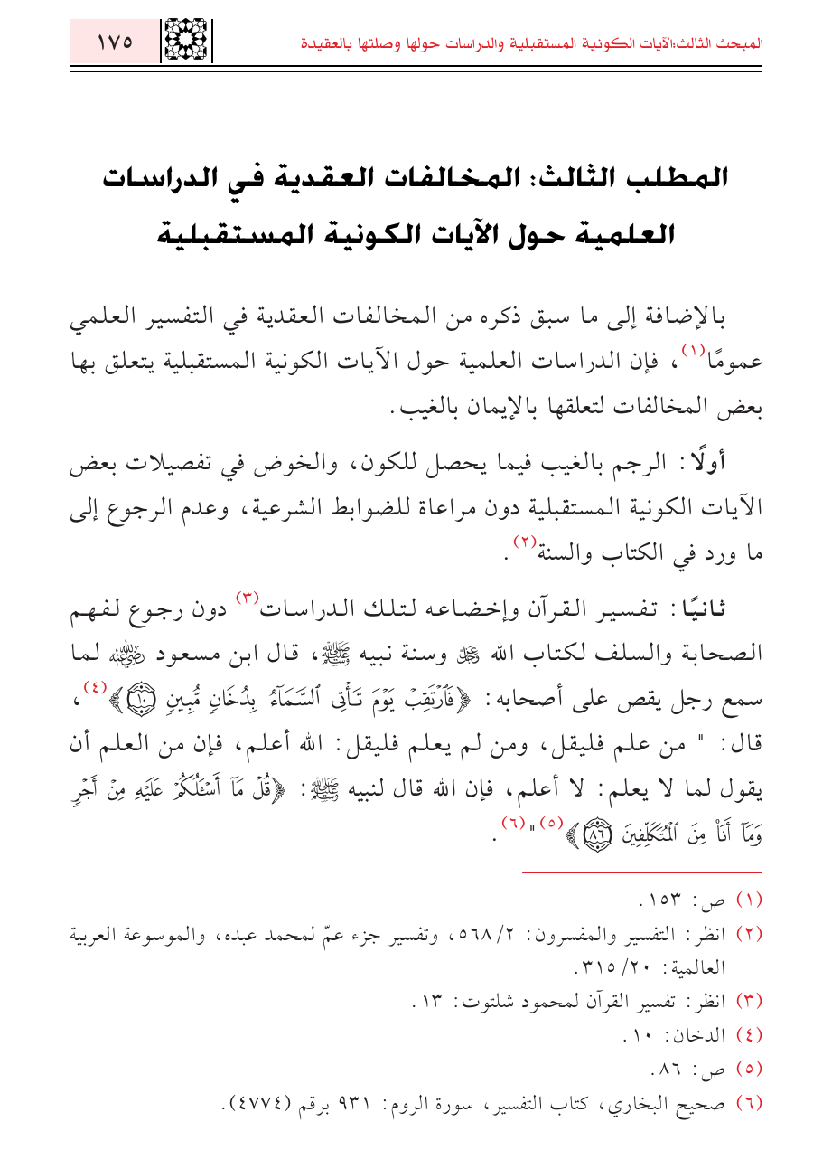 ثانياً: تفسير القرآن وإخضاعه لتلك الدراسات (¬٣) دون رجوع لفهم الصحابة والسلف لكتاب الله - عز وجل - وسنة نبيه - صلى الله عليه وسلم -، قال ابن مسعود - رضي الله عنه - لما سمع رجل يقص على أصحابه: {فَارْتَقِبْ يَوْمَ تَأْتِي السَّمَاءُ بِدُخَانٍ مُبِينٍ} (¬٤)، قال: " من علم فليقل، ومن لم يعلم فليقل: الله أعلم، فإن من العلم أن يقول لما لا يعلم: لا أعلم، فإن الله قال لنبيه - صلى الله عليه وسلم -: {قُلْ مَا أَسْأَلُكُمْ عَلَيْهِ مِنْ أَجْرٍ وَمَا أَنَا مِنَ الْمُتَكَلِّفِينَ} (¬٥) " (¬٦).