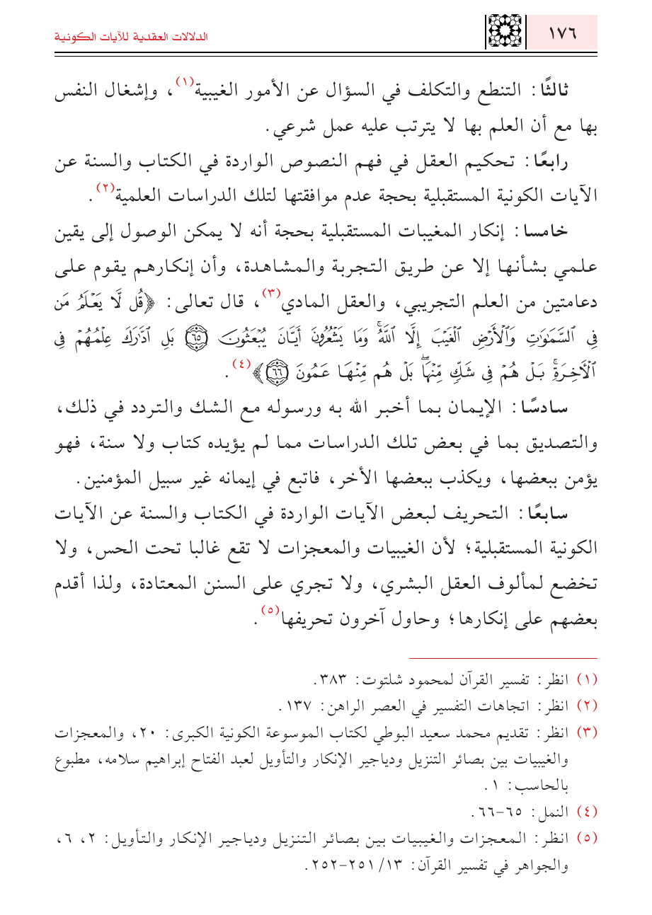 (¬٣) انظر: تقديم محمد سعيد البوطي لكتاب الموسوعة الكونية الكبرى: ٢٠، والمعجزات والغيبيات بين بصائر التنزيل ودياجير الإنكار والتأويل لعبد الفتاح إبراهيم سلامه، مطبوع بالحاسب: ١.