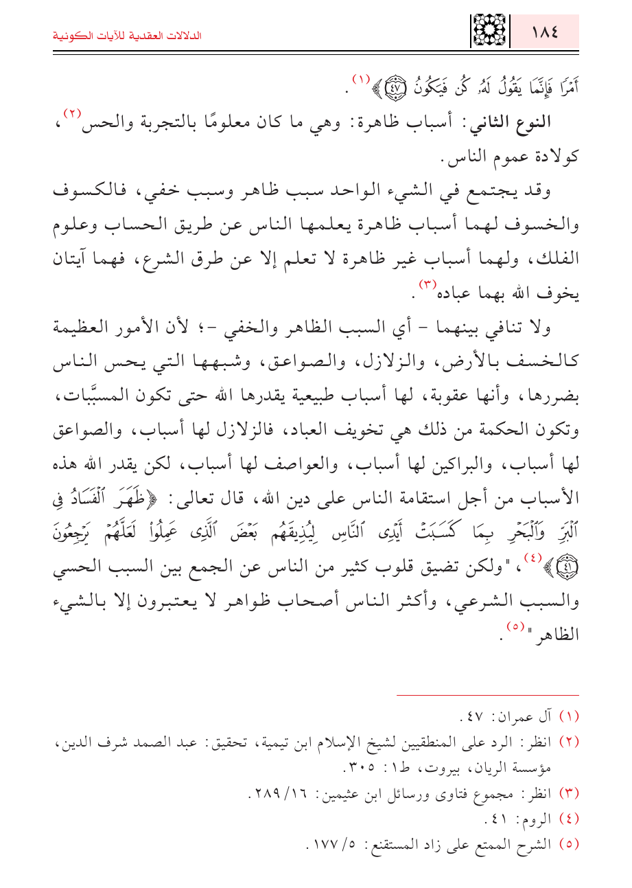 ولا تنافي بينهما - أي السبب الظاهر والخفي-؛ لأن الأمور العظيمة كالخسف بالأرض، والزلازل، والصواعق، وشبهها التي يحس الناس بضررها، وأنها عقوبة، لها أسباب طبيعية يقدرها الله حتى تكون المسبَّبات، وتكون الحكمة من ذلك هي تخويف العباد، فالزلازل لها أسباب، والصواعق لها أسباب، والبراكين لها أسباب، والعواصف لها أسباب، لكن يقدر الله هذه الأسباب من أجل استقامة الناس على دين الله، قال تعالى: {ظَهَرَ الْفَسَادُ فِي الْبَرِّ وَالْبَحْرِ بِمَا كَسَبَتْ أَيْدِي النَّاسِ لِيُذِيقَهُمْ بَعْضَ الَّذِي عَمِلُوا لَعَلَّهُمْ يَرْجِعُونَ} (¬٤)، "ولكن تضيق قلوب كثير من الناس عن الجمع بين السبب الحسي والسبب الشرعي، وأكثر الناس أصحاب ظواهر لا يعتبرون إلا بالشيء الظاهر" (¬٥).
