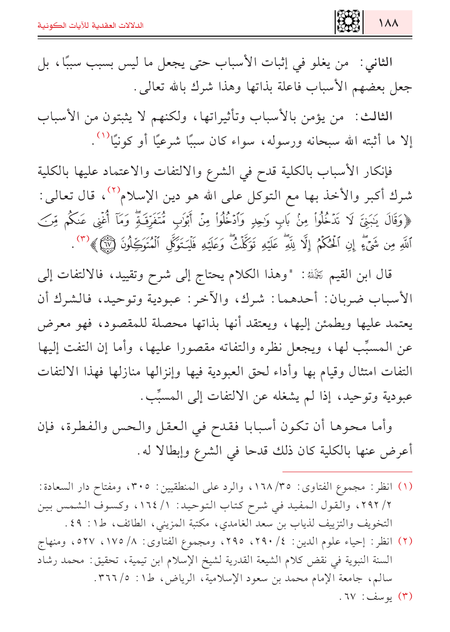 فإنكار الأسباب بالكلية قدح في الشرع والالتفات والاعتماد عليها بالكلية شرك أكبر والأخذ بها مع التوكل على الله هو دين الإسلام (¬٢)، قال تعالى: {وَقَالَ يَابَنِيَّ لَا تَدْخُلُوا مِنْ بَابٍ وَاحِدٍ وَادْخُلُوا مِنْ أَبْوَابٍ مُتَفَرِّقَةٍ وَمَا أُغْنِي عَنْكُمْ مِنَ اللَّهِ مِنْ شَيْءٍ إِنِ الْحُكْمُ إِلَّا لِلَّهِ عَلَيْهِ تَوَكَّلْتُ وَعَلَيْهِ فَلْيَتَوَكَّلِ الْمُتَوَكِّلُونَ} (¬٣).