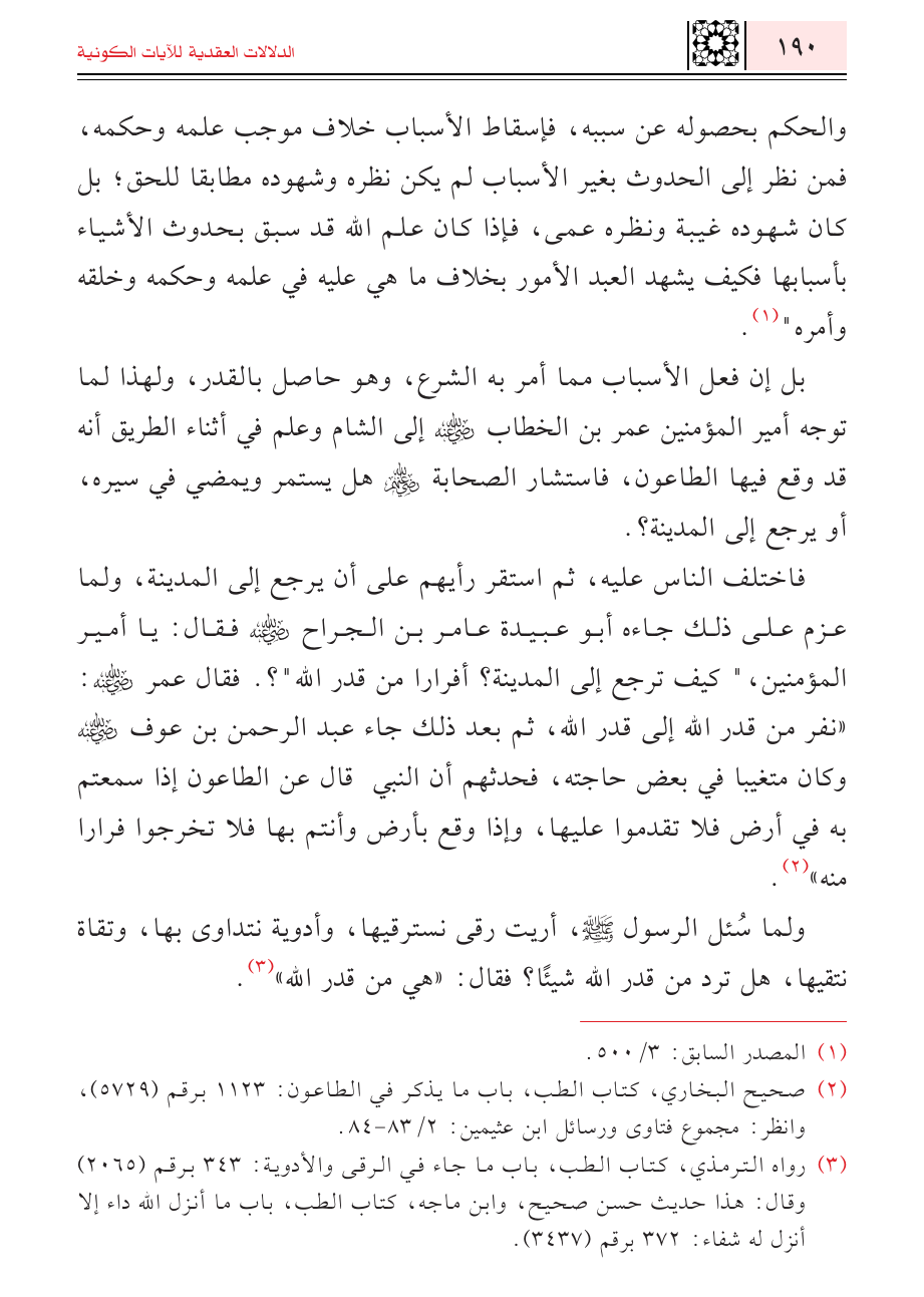 بل إن فعل الأسباب مما أمر به الشرع، وهو حاصل بالقدر، ولهذا لما توجه أمير المؤمنين عمر بن الخطاب - رضي الله عنه - إلى الشام وعلم في أثناء الطريق أنه قد وقع فيها الطاعون، فاستشار الصحابة - رضي الله عنهم - هل يستمر ويمضي في سيره، أو يرجع إلى المدينة؟ .