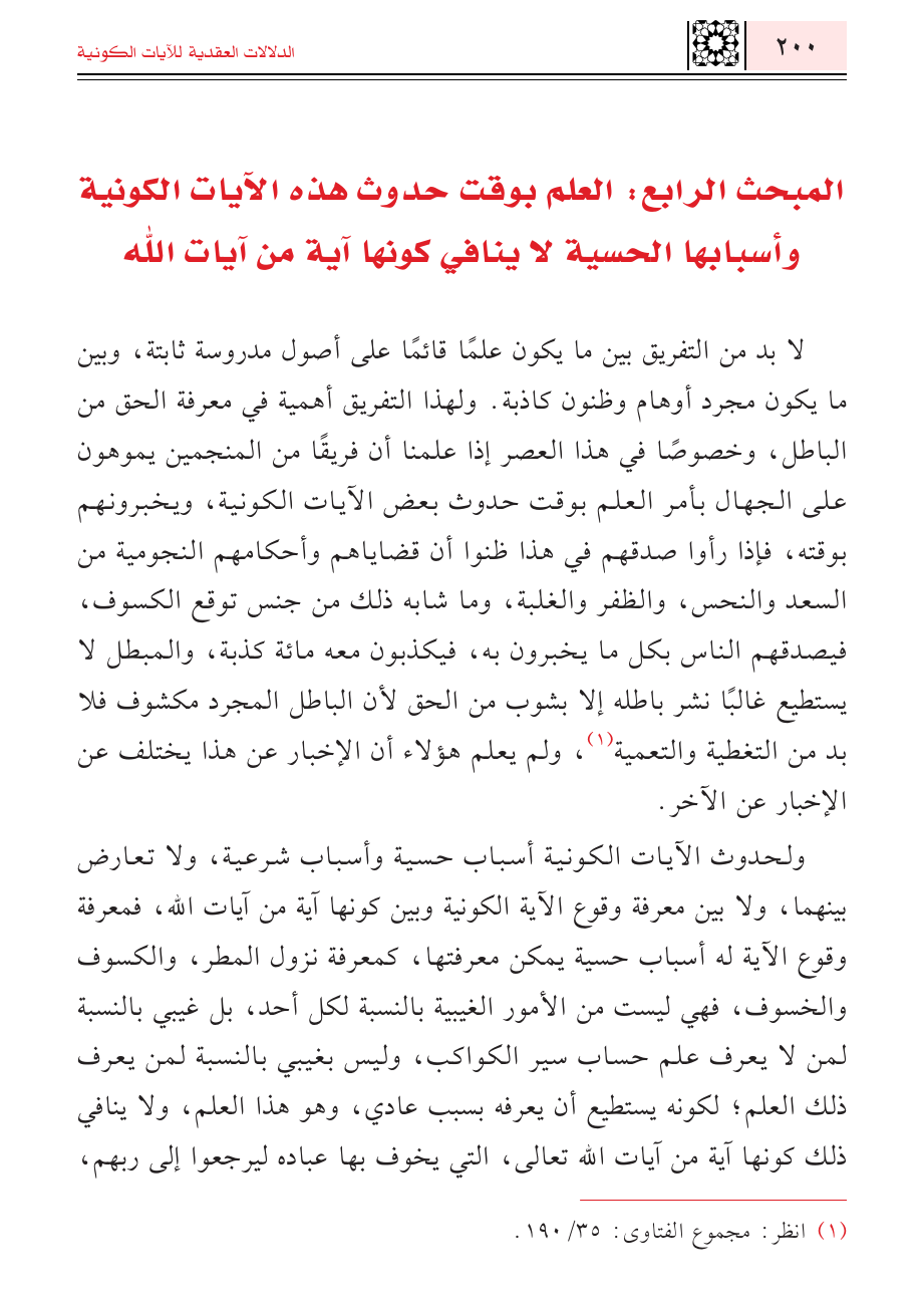 لا بد من التفريق بين ما يكون علماً قائماً على أصول مدروسة ثابتة، وبين ما يكون مجرد أوهام وظنون كاذبة. ولهذا التفريق أهمية في معرفة الحق من الباطل، وخصوصاً في هذا العصر إذا علمنا أن فريقاً من المنجمين يموهون على الجهال بأمر العلم بوقت حدوث بعض الآيات الكونية، ويخبرونهم بوقته، فإذا رأوا صدقهم في هذا ظنوا أن قضاياهم وأحكامهم النجومية من السعد والنحس، والظفر والغلبة، وما شابه ذلك من جنس توقع الكسوف، فيصدقهم الناس بكل ما يخبرون به، فيكذبون معه مائة كذبة، والمبطل لا يستطيع غالباً نشر باطله إلا بشوب من الحق لأن الباطل المجرد مكشوف فلا بد من التغطية والتعمية (¬١)، ولم يعلم هؤلاء أن الإخبار عن هذا يختلف عن الإخبار عن الآخر.