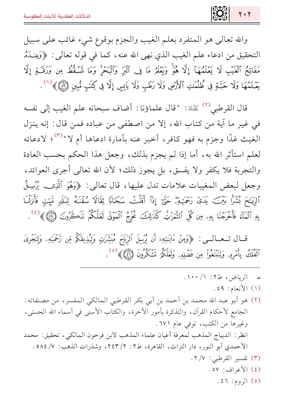 (¬٢) هو أبو عبد الله محمد بن أحمد بن أبي بكر القرطبي المالكي المفسر، من مصنفاته: الجامع لأحكام القرآن، والتذكرة بأمور الآخرة، والكتاب الأسنى في أسماء الله الحسنى، وغيرها من الكتب، توفي عام ٦٧١.
