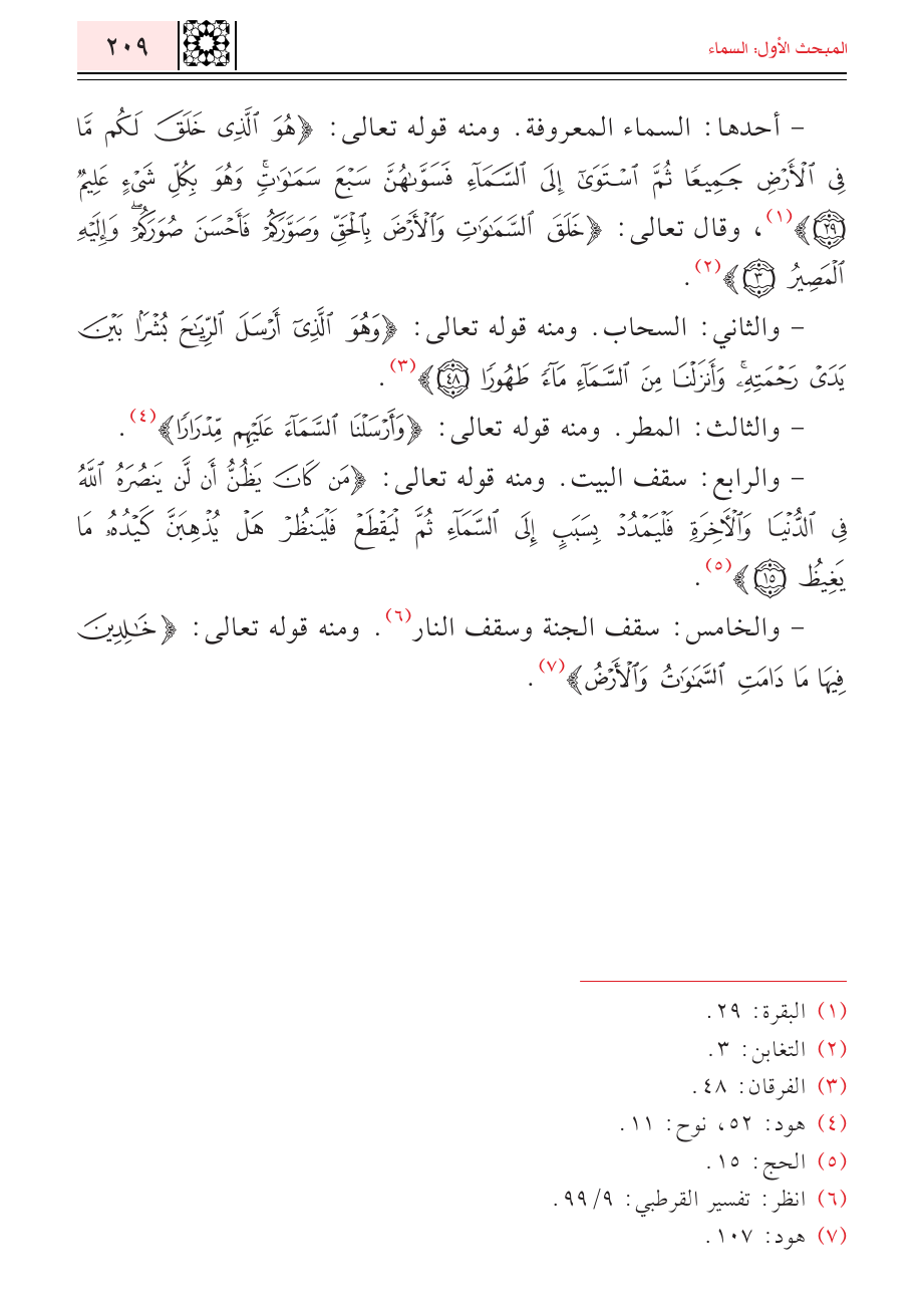 - والخامس: سقف الجنة وسقف النار (¬٦). ومنه قوله تعالى: {خَالِدِينَ فِيهَا مَا دَامَتِ السَّمَاوَاتُ وَالْأَرْضُ} (¬٧).
