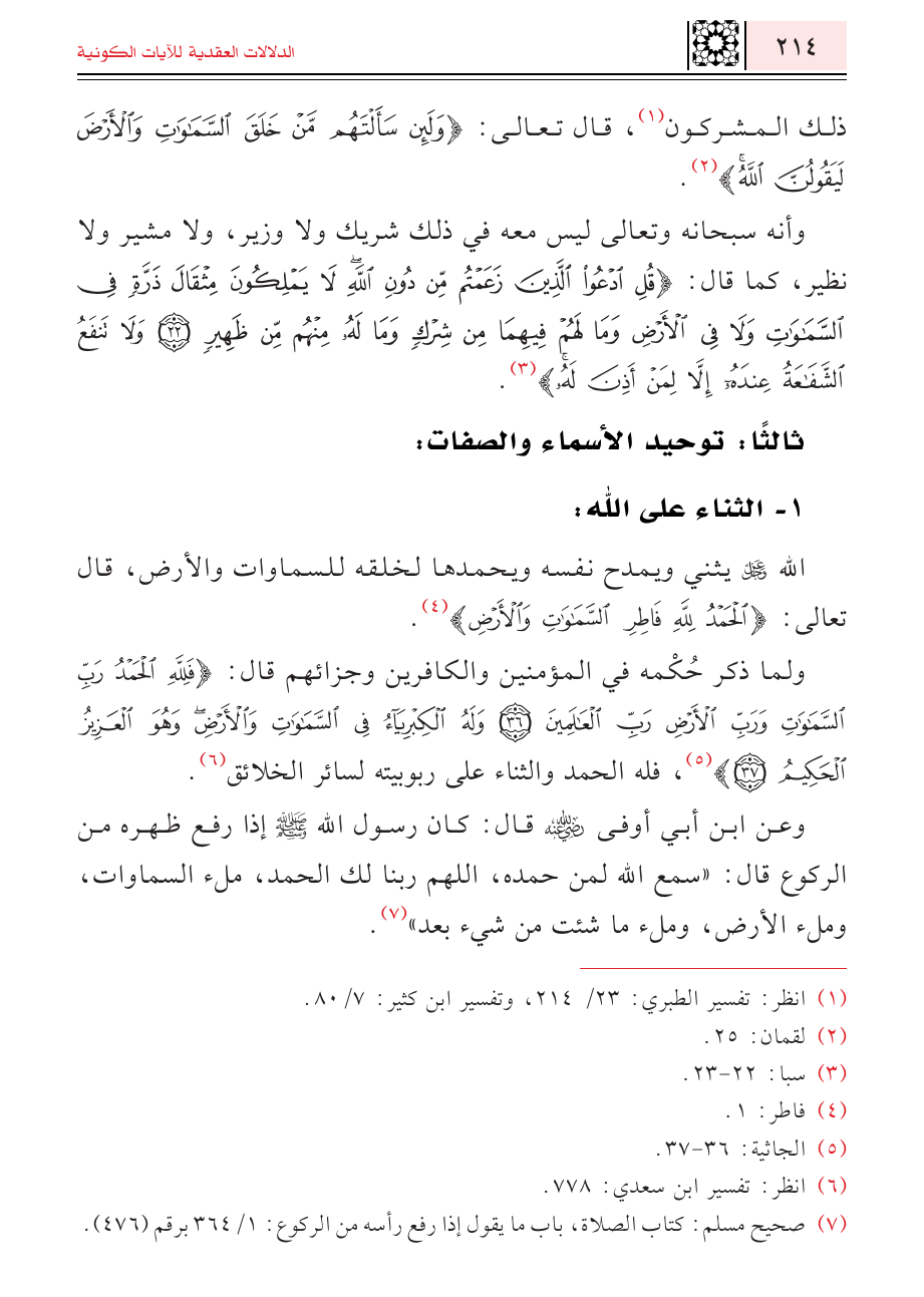 الله - عز وجل - يثني ويمدح نفسه ويحمدها لخلقه للسماوات والأرض، قال تعالى: {الْحَمْدُ لِلَّهِ فَاطِرِ السَّمَاوَاتِ وَالْأَرْضِ} (¬٤).