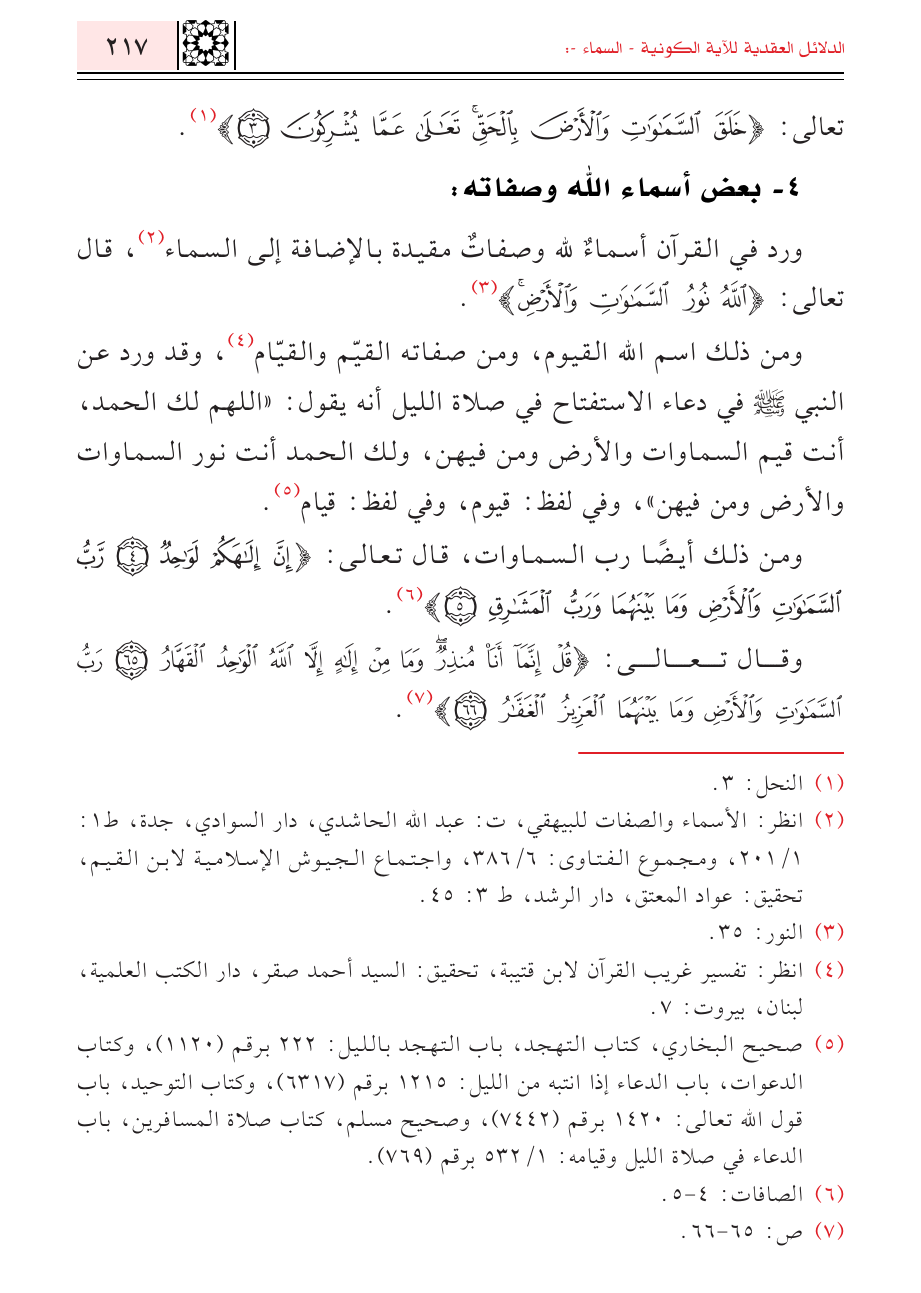 ورد في القرآن أسماءٌ لله وصفاتٌ مقيدة بالإضافة إلى السماء (¬٢)، قال تعالى: {اللَّهُ نُورُ السَّمَاوَاتِ وَالْأَرْضِ} (¬٣).