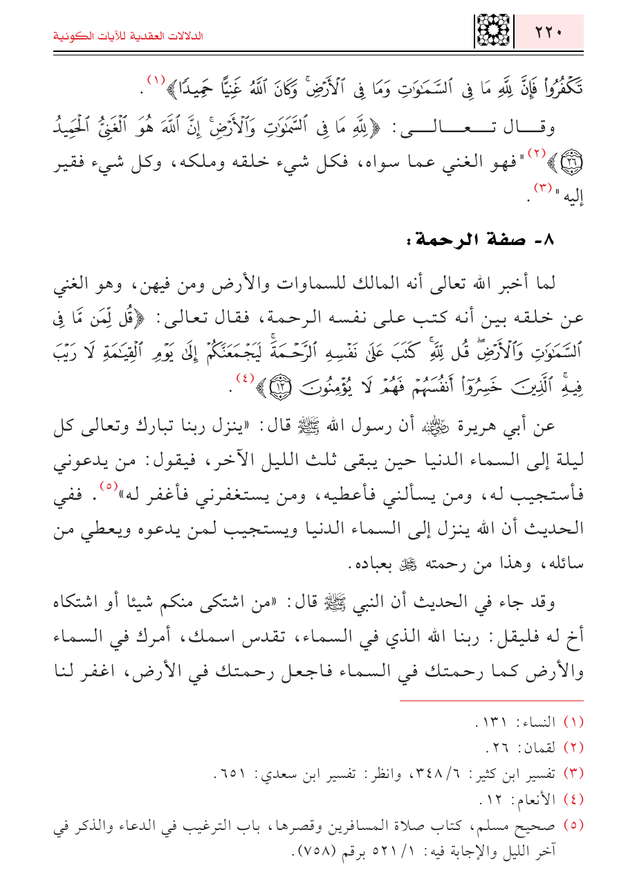 وقال تعالى: {لِلَّهِ مَا فِي السَّمَاوَاتِ وَالْأَرْضِ إِنَّ اللَّهَ هُوَ الْغَنِيُّ الْحَمِيدُ} (¬٢) "فهو الغني عما سواه، فكل شيء خلقه وملكه، وكل شيء فقير إليه" (¬٣).
