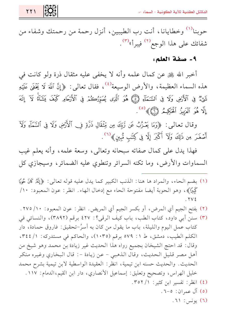 (¬٣) سنن أبي داود، كتاب الطب، باب كيف الرقى؟ : ٤٢٧ برقم (٣٨٩٢)، والنسائي في كتاب عمل اليوم والليلة، باب ما يقول من كان به أسرُ-تحقيق: فاروق حمادة، دار الكلم الطيب، دمشق، ط ١: ٥٧٩ برقم (١٠٣٥)، والحاكم في مستدركه: ١/ ٣٤٤، وقال: قد احتج الشيخان بجميع رواه هذا الحديث غير زيادة بن محمد وهو شيخ من أهل مصر قليل الحديث، وقال الذهبي - عن زيادة-: قال البخاري وغيره منكر الحديث. والحديث حسنه ابن تيمية، انظر: العقيدة الواسطية لابن تيمية بشرح محمد خليل الهراس، وتصحيح وتعليق: إسماعيل الأنصاري، دار ابن القيم، الدمام: ١١٧.