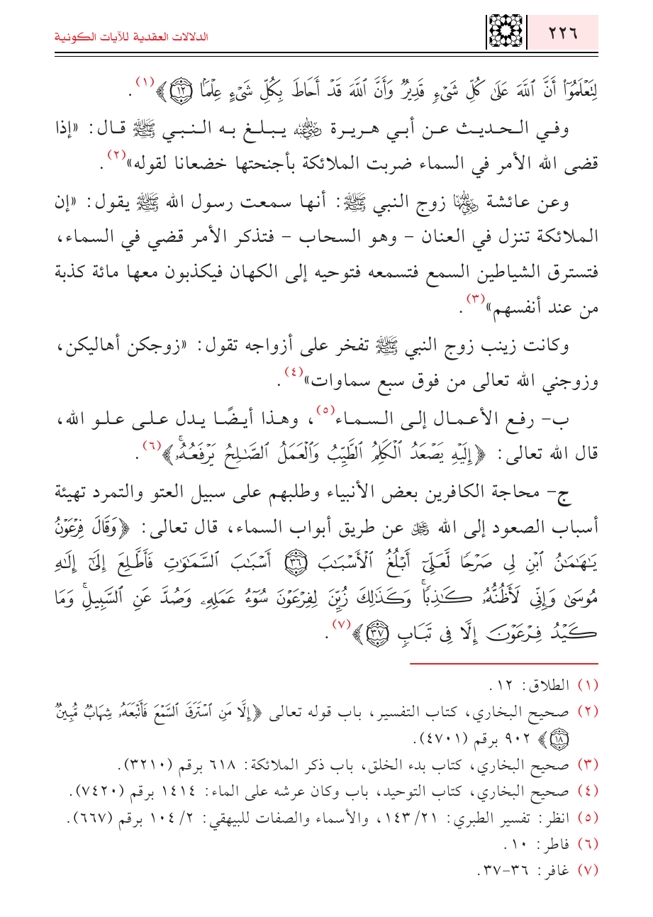 ب- رفع الأعمال إلى السماء (¬٥)، وهذا أيضاً يدل على علو الله، قال الله تعالى: {إِلَيْهِ يَصْعَدُ الْكَلِمُ الطَّيِّبُ وَالْعَمَلُ الصَّالِحُ يَرْفَعُهُ} (¬٦).