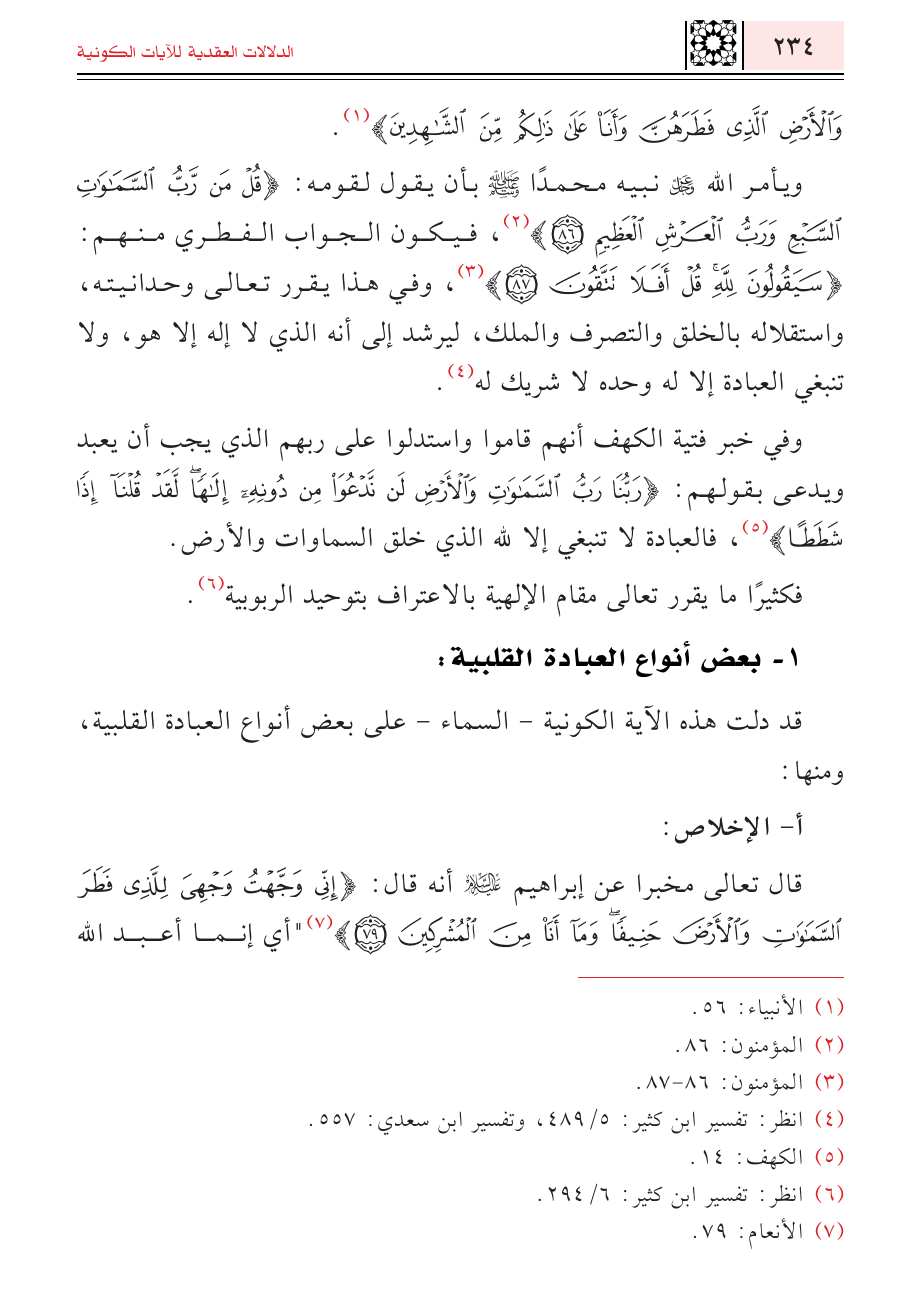 قال تعالى مخبرا عن إبراهيم - عليه السلام - أنه قال: {إِنِّي وَجَّهْتُ وَجْهِيَ لِلَّذِي فَطَرَ السَّمَاوَاتِ وَالْأَرْضَ حَنِيفًا وَمَا أَنَا مِنَ الْمُشْرِكِينَ} (¬٧) "أي إنما أعبد الله