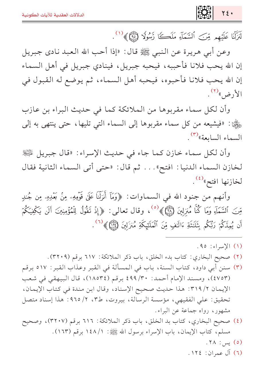 وأن لكل سماء مقربوها من الملائكة كما في حديث البراء بن عازب رضي الله عنه: " فيشيعه من كل سماء مقربوها إلى السماء التي تليها، حتى ينتهى به إلى السماء السابعة" (¬٣).