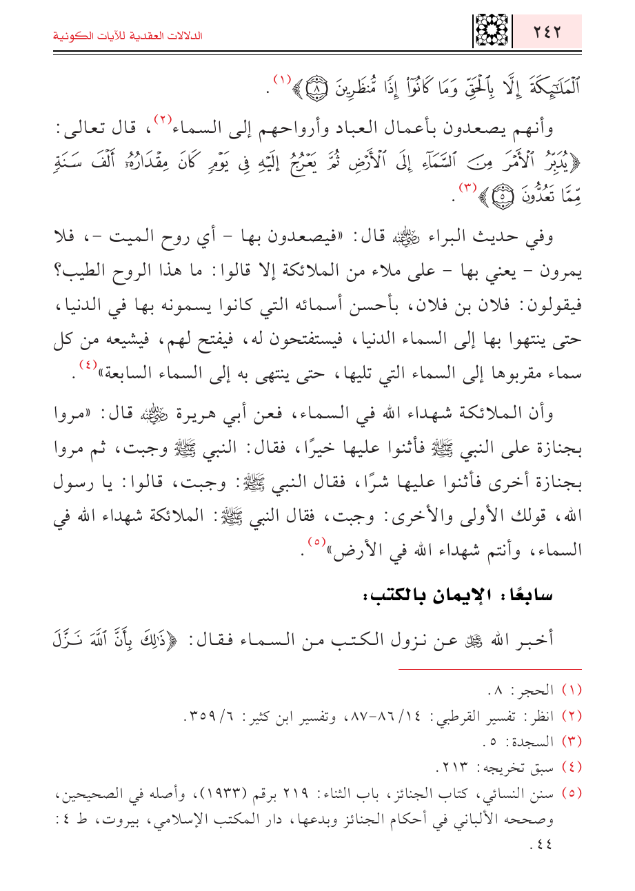 وأن الملائكة شهداء الله في السماء، فعن أبي هريرة - رضي الله عنه - قال: "مروا بجنازة على النبي - صلى الله عليه وسلم - فأثنوا عليها خيراً، فقال: النبي - صلى الله عليه وسلم - وجبت، ثم مروا بجنازة أخرى فأثنوا عليها شراً، فقال النبي - صلى الله عليه وسلم -: وجبت، قالوا: يا رسول الله، قولك الأولى والأخرى: وجبت، فقال النبي - صلى الله عليه وسلم -: الملائكة شهداء الله في السماء، وأنتم شهداء الله في الأرض" (¬٥).