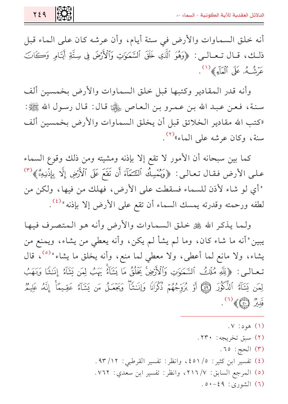 ولما يذكر الله - عز وجل - خلق السماوات والأرض وأنه هو المتصرف فيها يبين"أنه ما شاء كان، وما لم يشأ لم يكن، وأنه يعطي من يشاء، ويمنع من يشاء، ولا مانع لما أعطى، ولا معطي لما منع، وأنه يخلق ما يشاء" (¬٥)، قال تعالى: {لِلَّهِ مُلْكُ السَّمَاوَاتِ وَالْأَرْضِ يَخْلُقُ مَا يَشَاءُ يَهَبُ لِمَنْ يَشَاءُ إِنَاثًا وَيَهَبُ لِمَنْ يَشَاءُ الذُّكُورَ (٤٩) أَوْ يُزَوِّجُهُمْ ذُكْرَانًا وَإِنَاثًا وَيَجْعَلُ مَنْ يَشَاءُ عَقِيمًا إِنَّهُ عَلِيمٌ قَدِيرٌ} (¬٦).