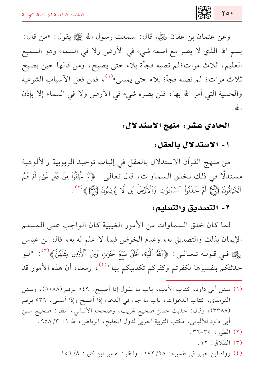 من منهج القرآن الاستدلال بالعقل في إثبات توحيد الربوبية والألوهية مستدلاً في ذلك بخلق السماوات، قال تعالى: {أَمْ خُلِقُوا مِنْ غَيْرِ شَيْءٍ أَمْ هُمُ الْخَالِقُونَ (٣٥) أَمْ خَلَقُوا السَّمَاوَاتِ وَالْأَرْضَ بَلْ لَا يُوقِنُونَ} (¬٢).