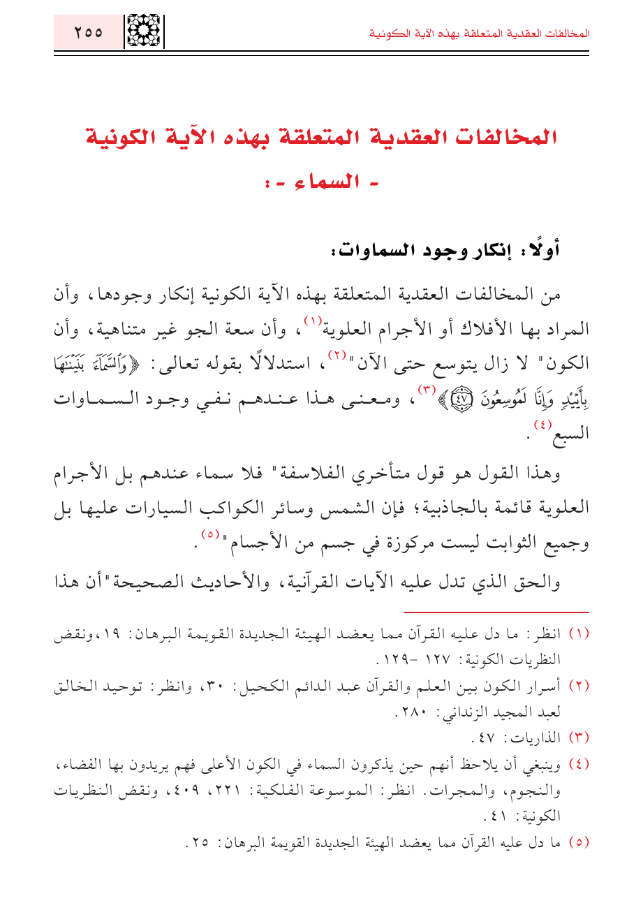 (¬٤) وينبغي أن يلاحظ أنهم حين يذكرون السماء في الكون الأعلى فهم يريدون بها الفضاء، والنجوم، والمجرات. انظر: الموسوعة الفلكية: ٢٢١، ٤٠٩، ونقض النظريات الكونية: ٤١.