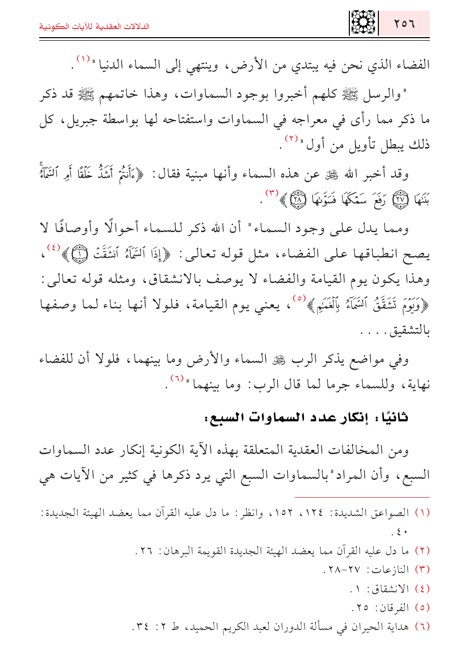 ومما يدل على وجود السماء" أن الله ذكر للسماء أحوالاً وأوصافاً لا يصح انطباقها على الفضاء، مثل قوله تعالى: {إِذَا السَّمَاءُ انْشَقَّتْ} (¬٤)، وهذا يكون يوم القيامة والفضاء لا يوصف بالانشقاق، ومثله قوله تعالى: {وَيَوْمَ تَشَقَّقُ السَّمَاءُ بِالْغَمَامِ} (¬٥)، يعني يوم القيامة، فلولا أنها بناء لما وصفها بالتشقيق ....