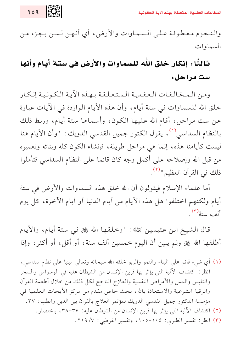 ومن المخالفات العقدية المتعلقة بهذه الآية الكونية إنكار خلق الله للسماوات في ستة أيام، وأن هذه الأيام الواردة في الآيات عبارة عن ست مراحل، أقام الله عليها الكون، وأسماها ستة أيام، وربط ذلك بالنظام السداسي (¬١)، يقول الكتور جميل القدسي الدويك: "وأن الأيام هنا ليست كأيامنا هذه، إنما هي مراحل طويلة , فإنشاء الكون كله وبنائه وتعميره من قبل الله وإصلاحه على أكمل وجه كان قائما على النظام السداسي فتأملوا ذلك في القرآن العظيم" (¬٢).