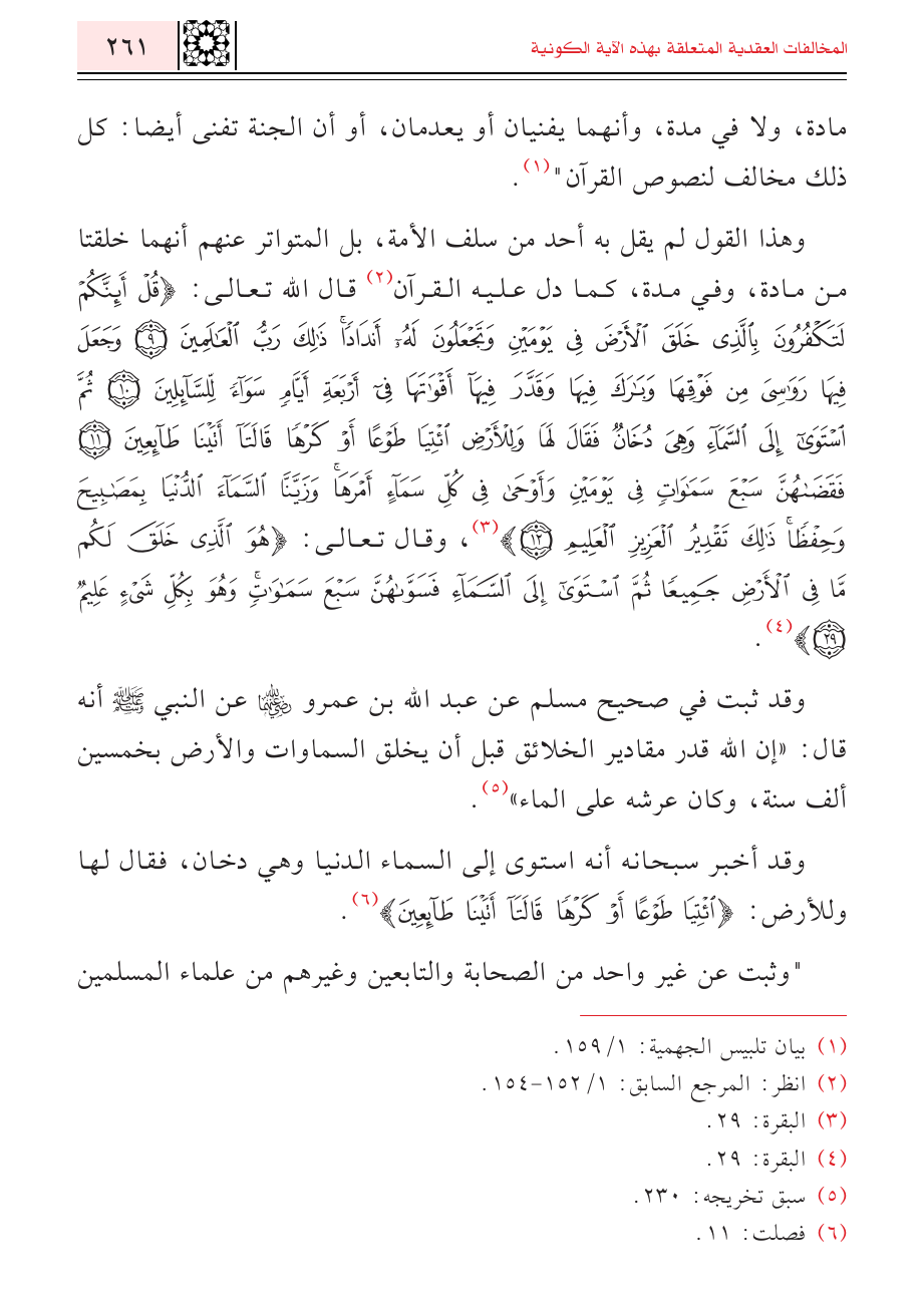 مادة، ولا في مدة، وأنهما يفنيان أو يعدمان، أو أن الجنة تفنى أيضا: كل ذلك مخالف لنصوص القرآن" (¬١).