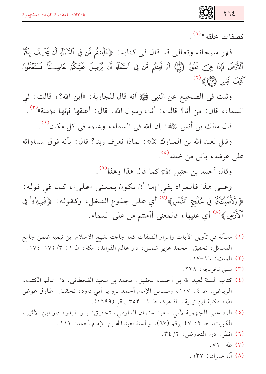 (¬١) مسألة في تأويل الآيات وإمرار الصفات كما جاءت لشيخ الإسلام ابن تيمية ضمن جامع المسائل، تحقيق: محمد عزير شمس، دار عالم الفوائد، مكة، ط ١: ٣/ ١٧٢ - ١٧٤.