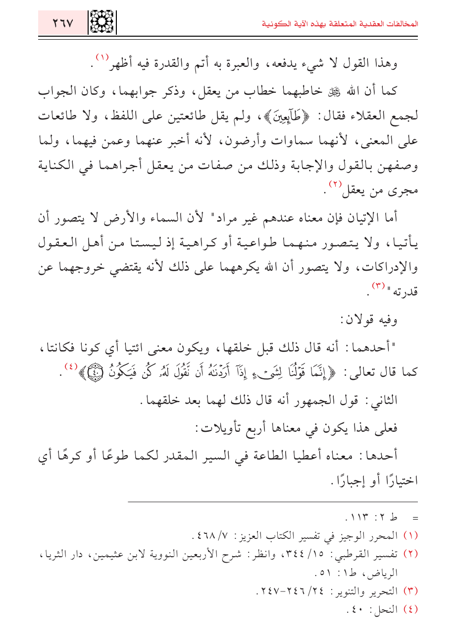 أما الإتيان فإن معناه عندهم غير مراد" لأن السماء والأرض لا يتصور أن يأتيا، ولا يتصور منهما طواعية أو كراهية إذ ليستا من أهل العقول والإدراكات، ولا يتصور أن الله يكرههما على ذلك لأنه يقتضي خروجهما عن قدرته" (¬٣).