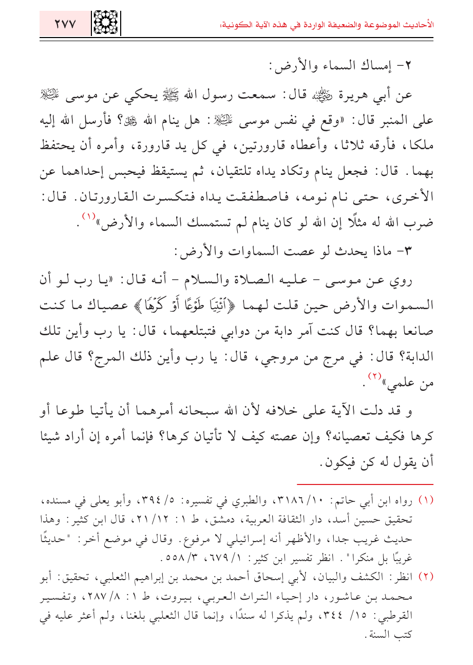 روي عن موسى -عليه الصلاة والسلام- أنه قال: " يا رب لو أن السموات والأرض حين قلت لهما {ائْتِيَا طَوْعًا أَوْ كَرْهًا} عصياك ما كنت صانعا بهما؟ قال كنت آمر دابة من دوابي فتبتلعهما، قال: يا رب وأين تلك الدابة؟ قال: في مرج من مروجي، قال: يا رب وأين ذلك المرج؟ قال علم من علمي" (¬٢).