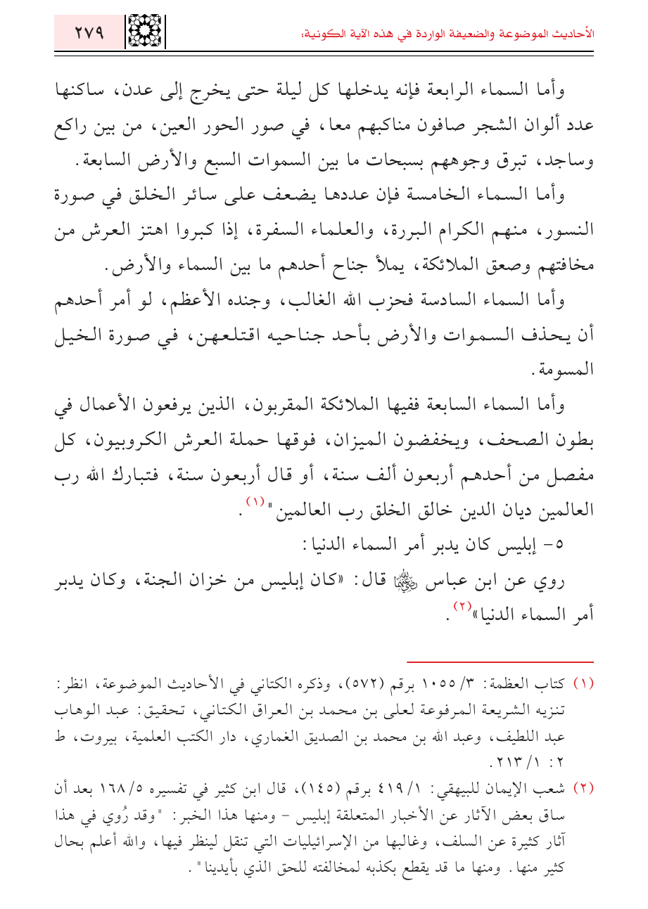(¬٢) شعب الإيمان للبيهقي: ١/ ٤١٩ برقم (١٤٥)، قال ابن كثير في تفسيره ٥/ ١٦٨ بعد أن ساق بعض الآثار عن الأخبار المتعلقة إبليس - ومنها هذا الخبر: "وقد رُوي في هذا آثار كثيرة عن السلف، وغالبها من الإسرائيليات التي تنقل لينظر فيها، والله أعلم بحال كثير منها. ومنها ما قد يقطع بكذبه لمخالفته للحق الذي بأيدينا".