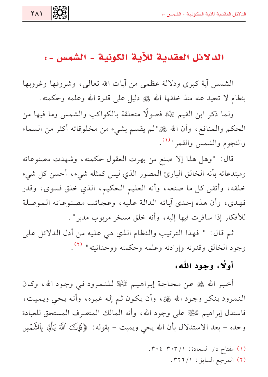 ثم قال: " فهذا الترتيب والنظام الذي هي عليه من أدل الدلائل على وجود الخالق وقدرته وإرادته وعلمه وحكمته ووحدانيته" (¬٢).