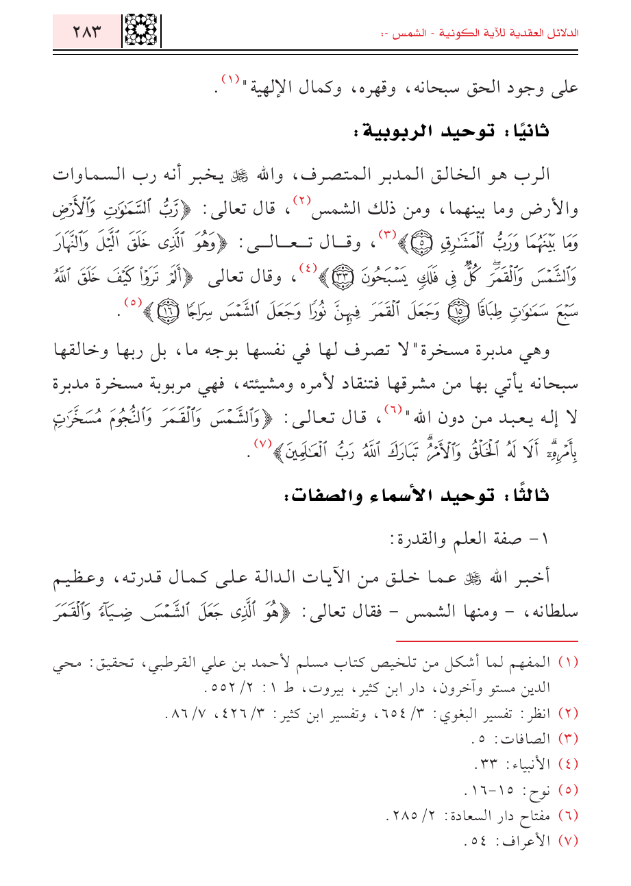 الرب هو الخالق المدبر المتصرف، والله - عز وجل - يخبر أنه رب السماوات والأرض وما بينهما، ومن ذلك الشمس (¬٢)، قال تعالى: {رَبُّ السَّمَاوَاتِ وَالْأَرْضِ وَمَا بَيْنَهُمَا وَرَبُّ الْمَشَارِقِ} (¬٣)، وقال تعالى: {وَهُوَ الَّذِي خَلَقَ اللَّيْلَ وَالنَّهَارَ وَالشَّمْسَ وَالْقَمَرَ كُلٌّ فِي فَلَكٍ يَسْبَحُونَ} (¬٤)، وقال تعالى {أَلَمْ تَرَوْا كَيْفَ خَلَقَ اللَّهُ سَبْعَ سَمَاوَاتٍ طِبَاقًا (١٥) وَجَعَلَ الْقَمَرَ فِيهِنَّ نُورًا وَجَعَلَ الشَّمْسَ سِرَاجًا} (¬٥).