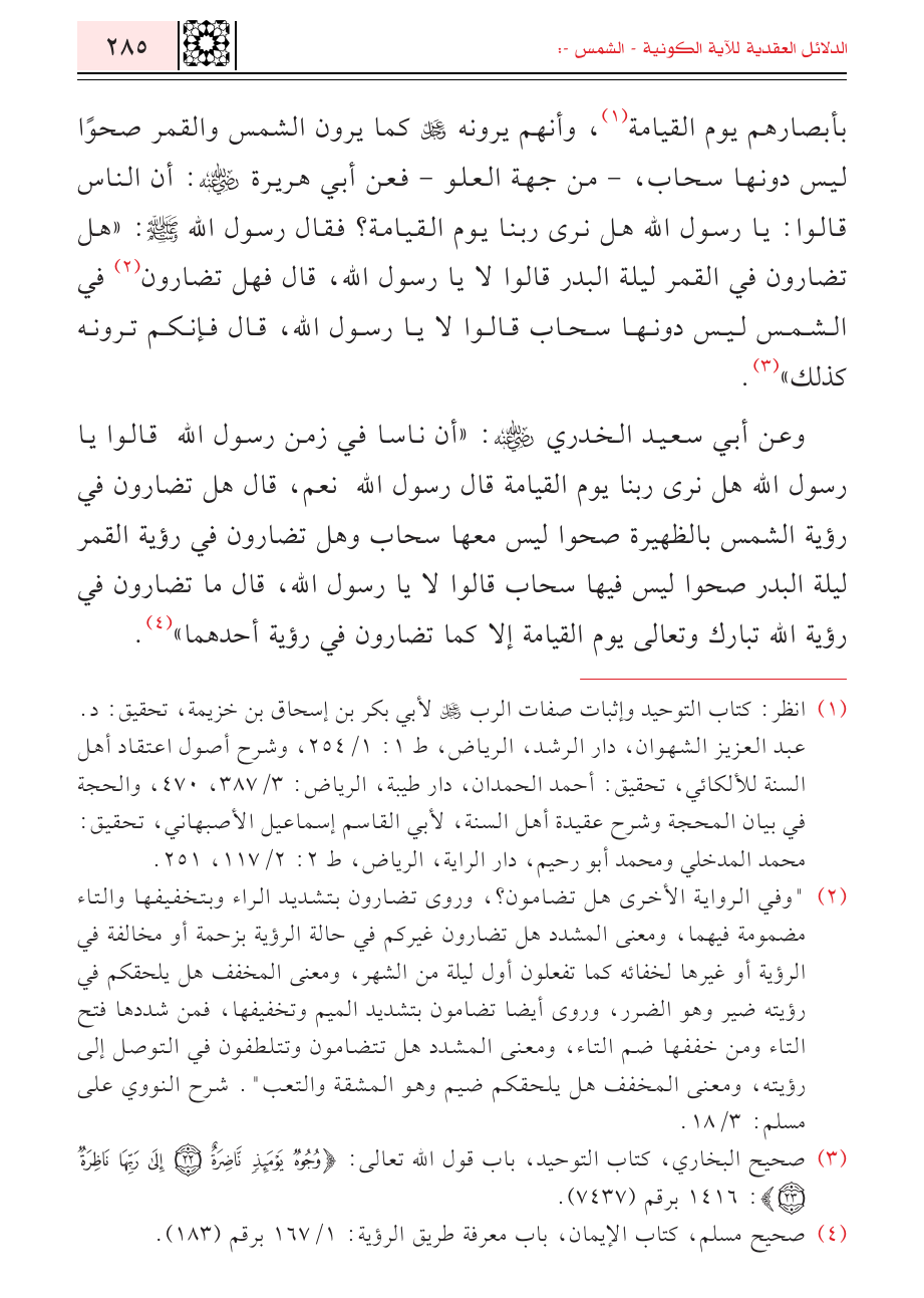 (¬٣) صحيح البخاري، كتاب التوحيد، باب قول الله تعالى: {وُجُوهٌ يَوْمَئِذٍ نَاضِرَةٌ (٢٢) إِلَى رَبِّهَا نَاظِرَةٌ}: ١٤١٦ برقم (٧٤٣٧).