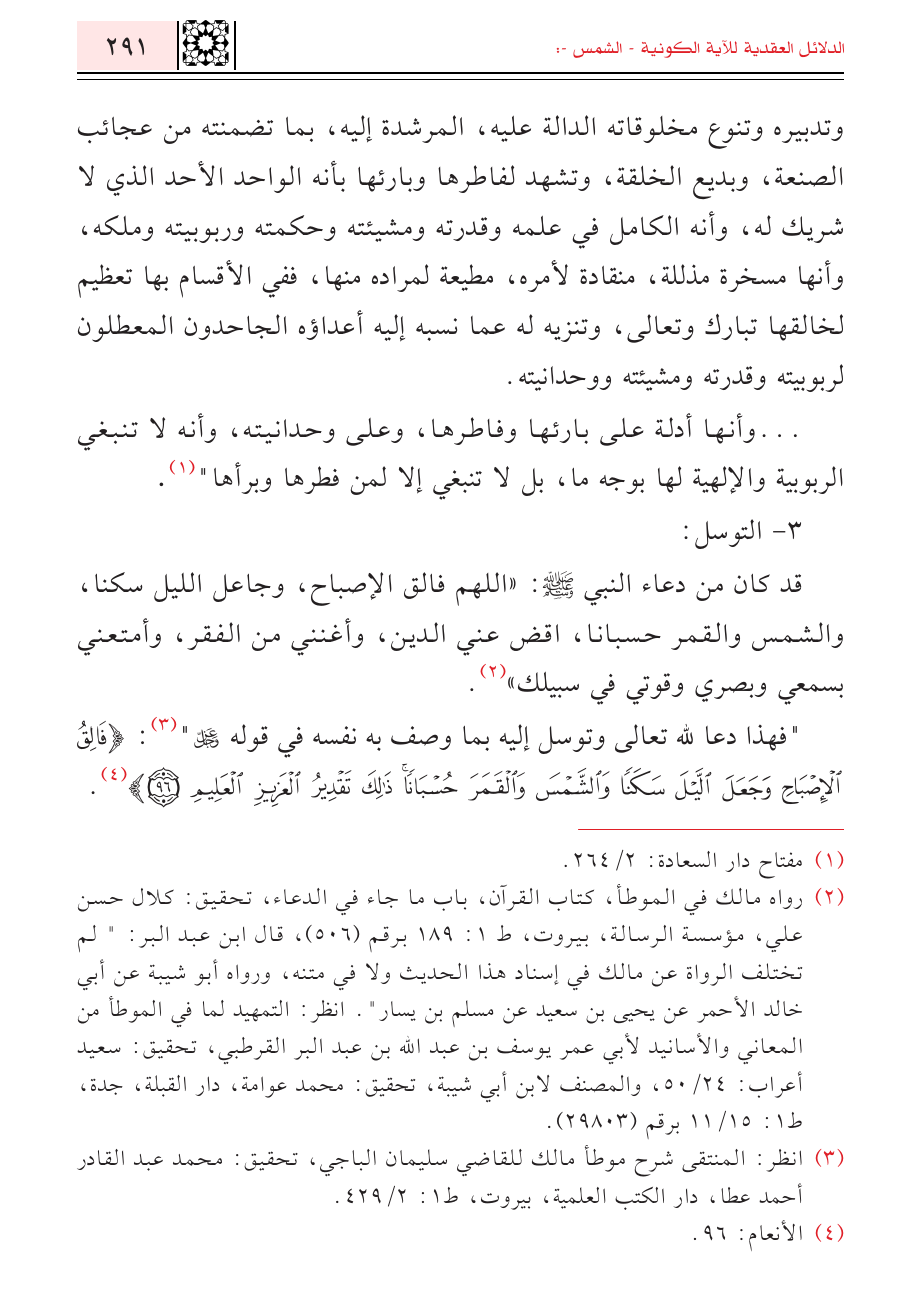 "فهذا دعا لله تعالى وتوسل إليه بما وصف به نفسه في قوله - عز وجل - " (¬٣): {فَالِقُ الْإِصْبَاحِ وَجَعَلَ اللَّيْلَ سَكَنًا وَالشَّمْسَ وَالْقَمَرَ حُسْبَانًا ذَلِكَ تَقْدِيرُ الْعَزِيزِ الْعَلِيمِ} (¬٤).