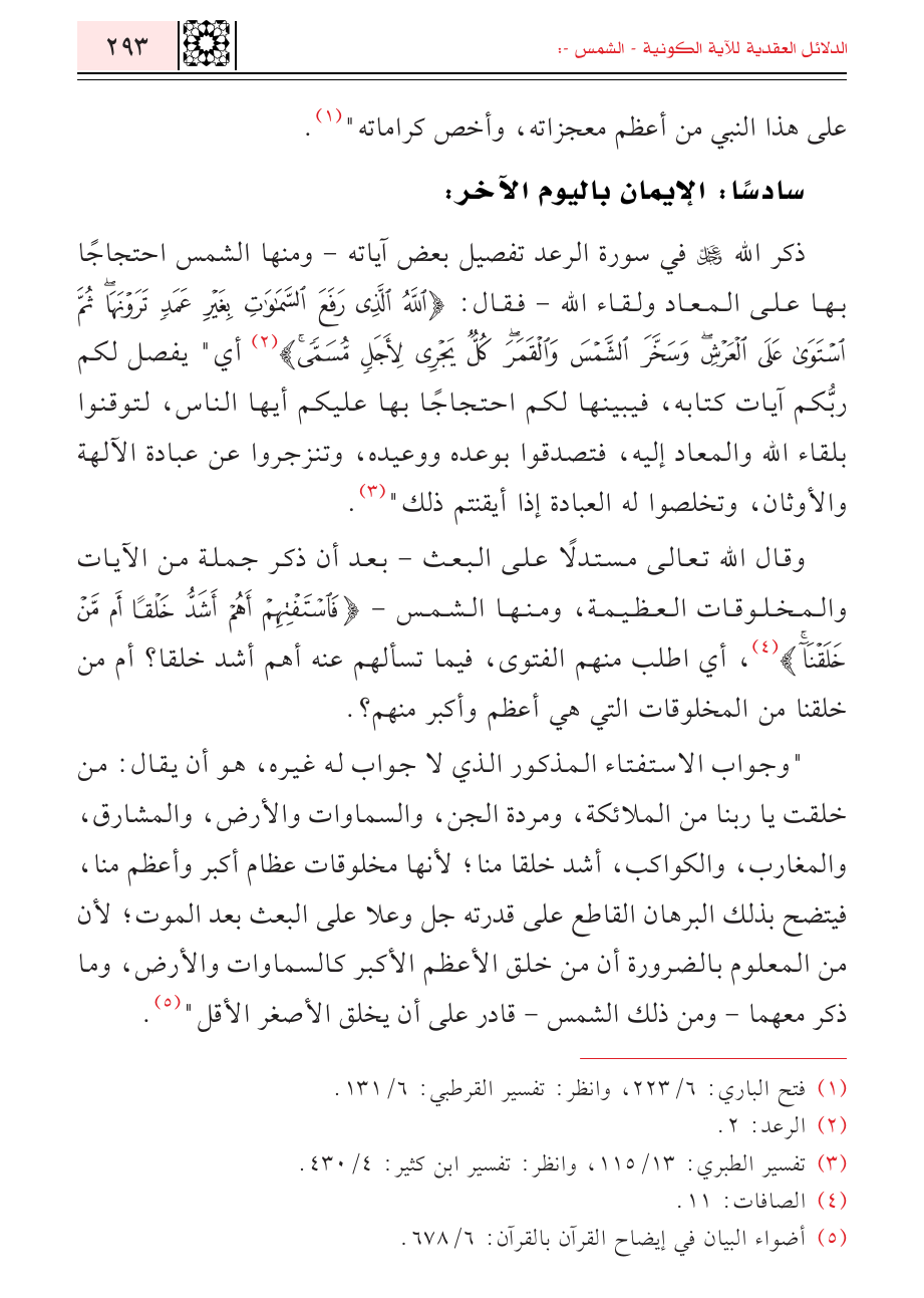 وقال الله تعالى مستدلاً على البعث - بعد أن ذكر جملة من الآيات والمخلوقات العظيمة، ومنها الشمس - {فَاسْتَفْتِهِمْ أَهُمْ أَشَدُّ خَلْقًا أَمْ مَنْ خَلَقْنَا} (¬٤)، أي اطلب منهم الفتوى، فيما تسألهم عنه أهم أشد خلقا؟ أم من خلقنا من المخلوقات التي هي أعظم وأكبر منهم؟ .