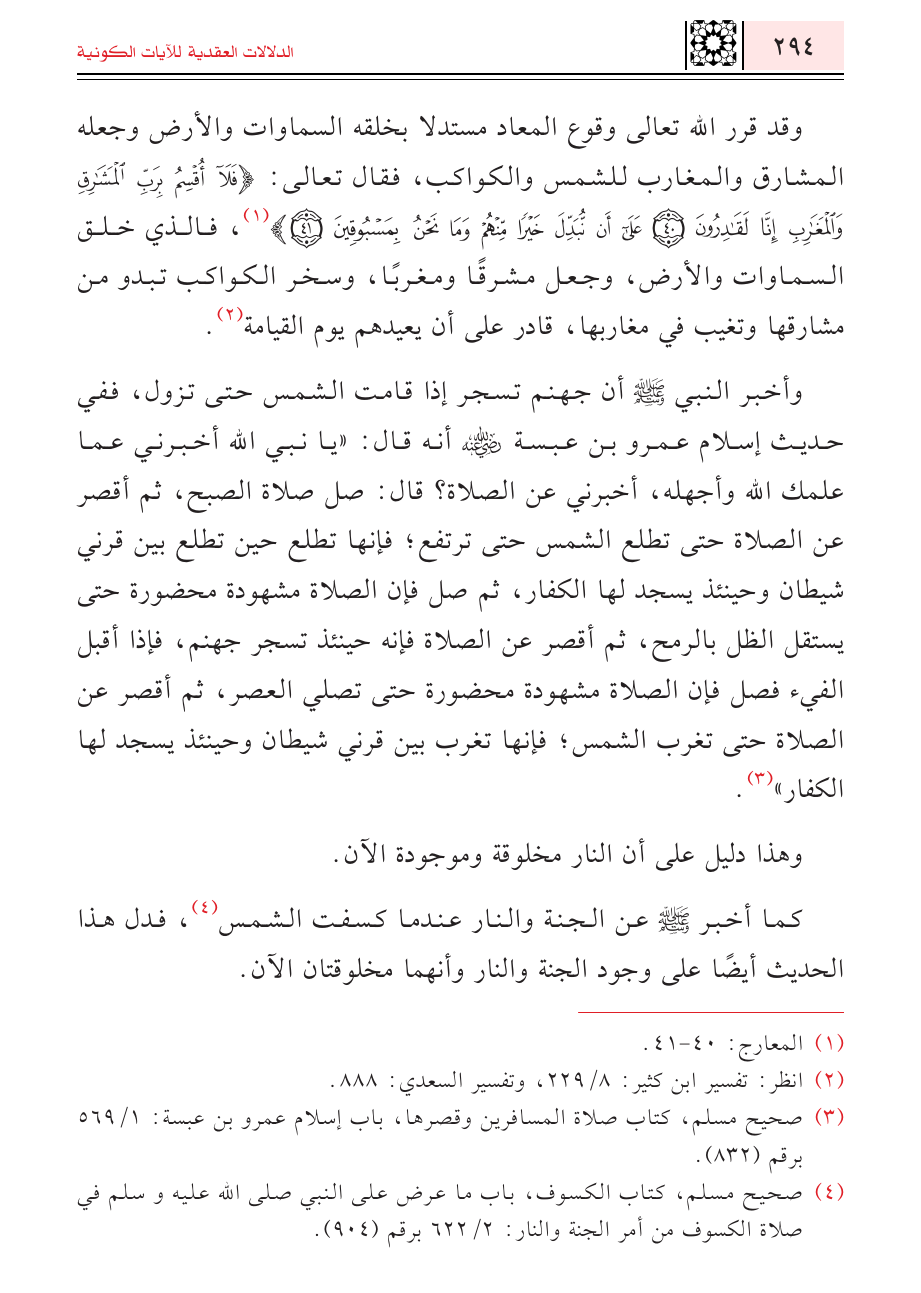 وقد قرر الله تعالى وقوع المعاد مستدلا بخلقه السماوات والأرض وجعله المشارق والمغارب للشمس والكواكب، فقال تعالى: {فَلَا أُقْسِمُ بِرَبِّ الْمَشَارِقِ وَالْمَغَارِبِ إِنَّا لَقَادِرُونَ (٤٠) عَلَى أَنْ نُبَدِّلَ خَيْرًا مِنْهُمْ وَمَا نَحْنُ بِمَسْبُوقِينَ} (¬١)، فالذي خلق السماوات والأرض، وجعل مشرقاً ومغرباً، وسخر الكواكب تبدو من مشارقها وتغيب في مغاربها، قادر على أن يعيدهم يوم القيامة (¬٢).