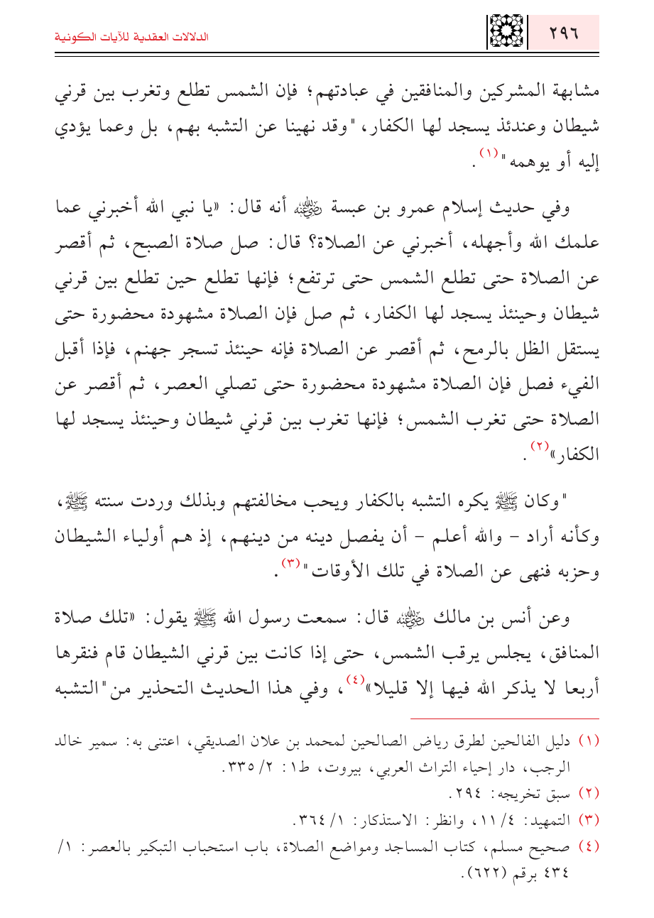 وعن أنس بن مالك - رضي الله عنه - قال: سمعت رسول الله - صلى الله عليه وسلم - يقول: " تلك صلاة المنافق، يجلس يرقب الشمس، حتى إذا كانت بين قرني الشيطان قام فنقرها أربعا لا يذكر الله فيها إلا قليلا" (¬٤)، وفي هذا الحديث التحذير من"التشبه