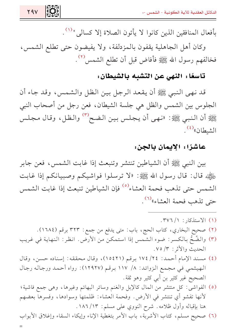 بين النبي - صلى الله عليه وسلم - أن الشياطين تنتشر وتنبعث إذا غابت الشمس، فعن جابر - رضي الله عنه - قال: قال رسول الله - صلى الله عليه وسلم -: " لا ترسلوا فواشيكم وصبيانكم إذا غابت الشمس حتى تذهب فحمة العشاء (¬٥)؛ فإن الشياطين تنبعث إذا غابت الشمس حتى تذهب فحمة العشاء" (¬٦).